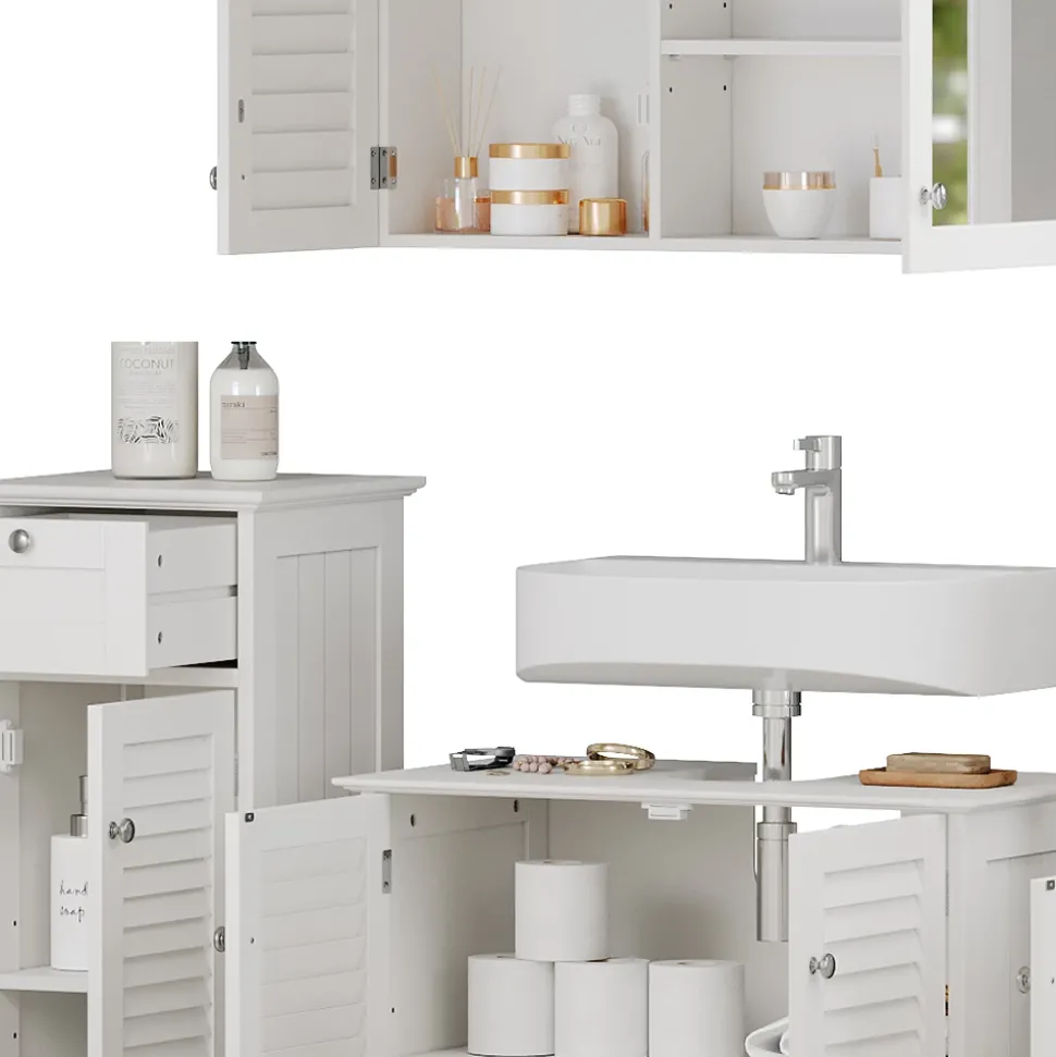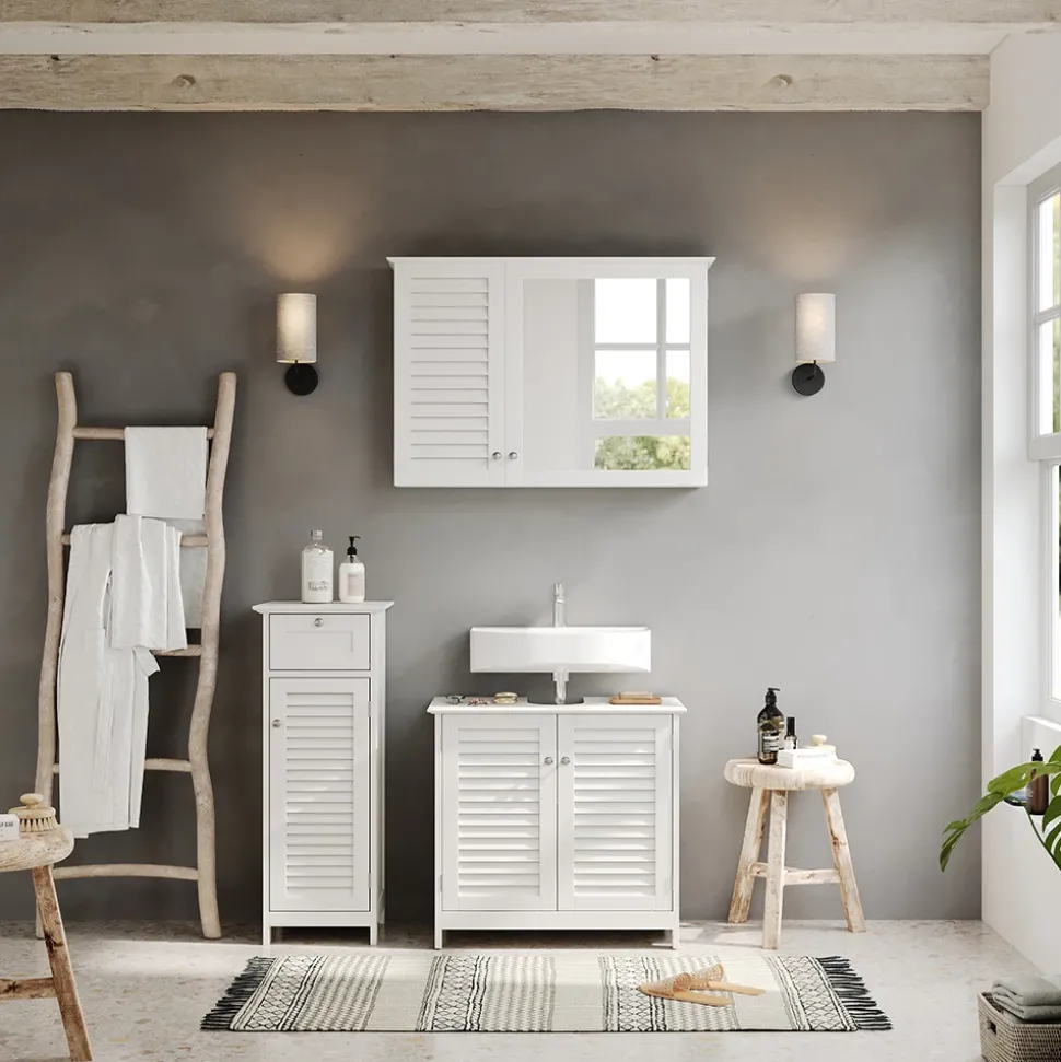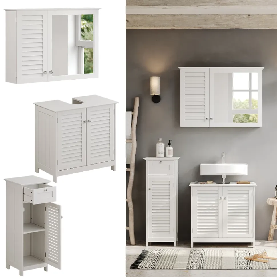 - Erleben Sie das Vicco Badmöbel-Set Riad: moderne Badserie in strahlendem Weiß mit Lamellen-Fronten. Nutzen Sie den Stauraum in Ihrem Bad mit unseren Badezimmermöbeln optimal aus.