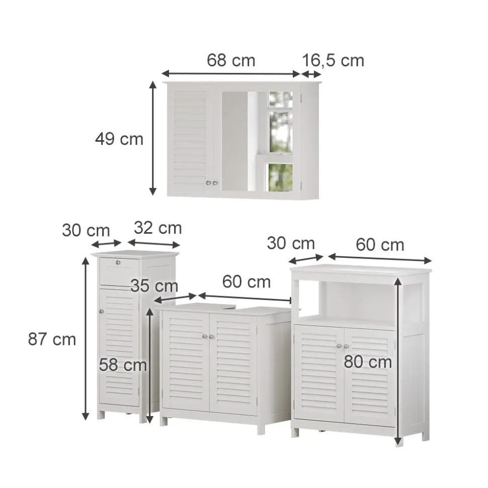 - PRODUKTMAßE: Sideboard: 60 x 80 x 30 cm, 12 kg. Spiegelschrank: 68 x 49 x 16,5 cm, 9,75 kg. Midischrank: 32 x 87 x 30 cm, 8,5 kg. Waschtischunterschrank: 60 x 58 x 35 cm, 10 kg (BxHxT).