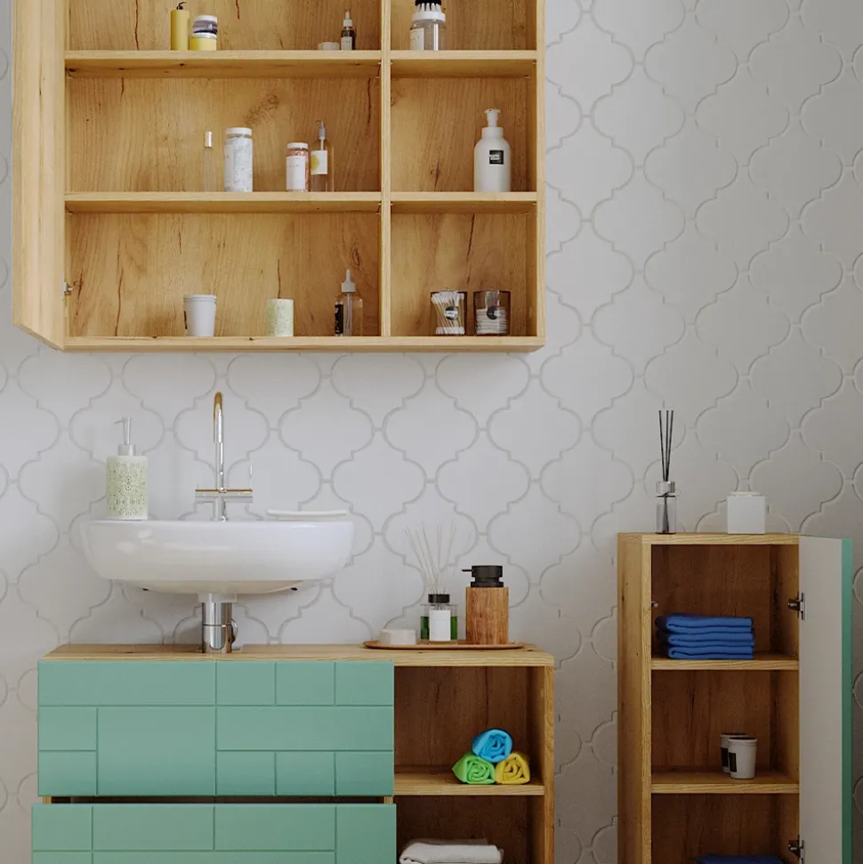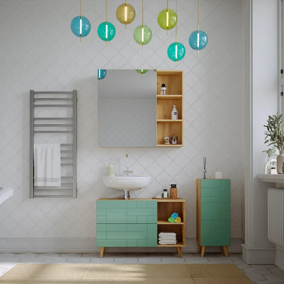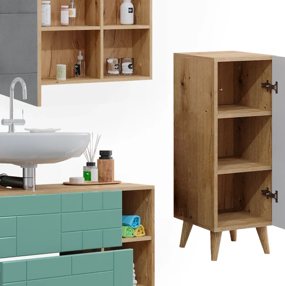 - Entdecken Sie das moderne Vicco Badmöbel-Set Rudi im Eiche-Evoke – Mint-Design. Die stilvolle Badserie bietet vielseitige Möbel für einen optimierten Stauraum im Badezimmer.