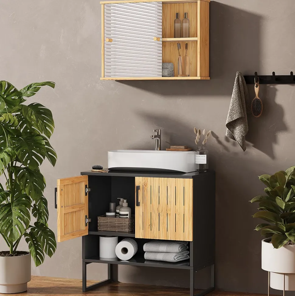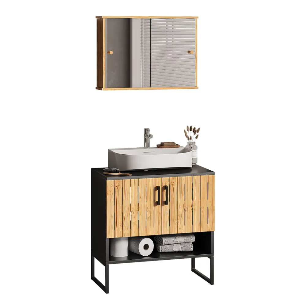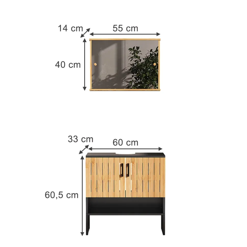 - MATERIAL: Das Badmöbel-Set besteht aus einer pflegeleichten MDF, 15 mm. Die Fronten sind aus lackiertem Bambus. Einige Bestandteile des Artikels sind aus Stahl, 16 mm gefertigt.
