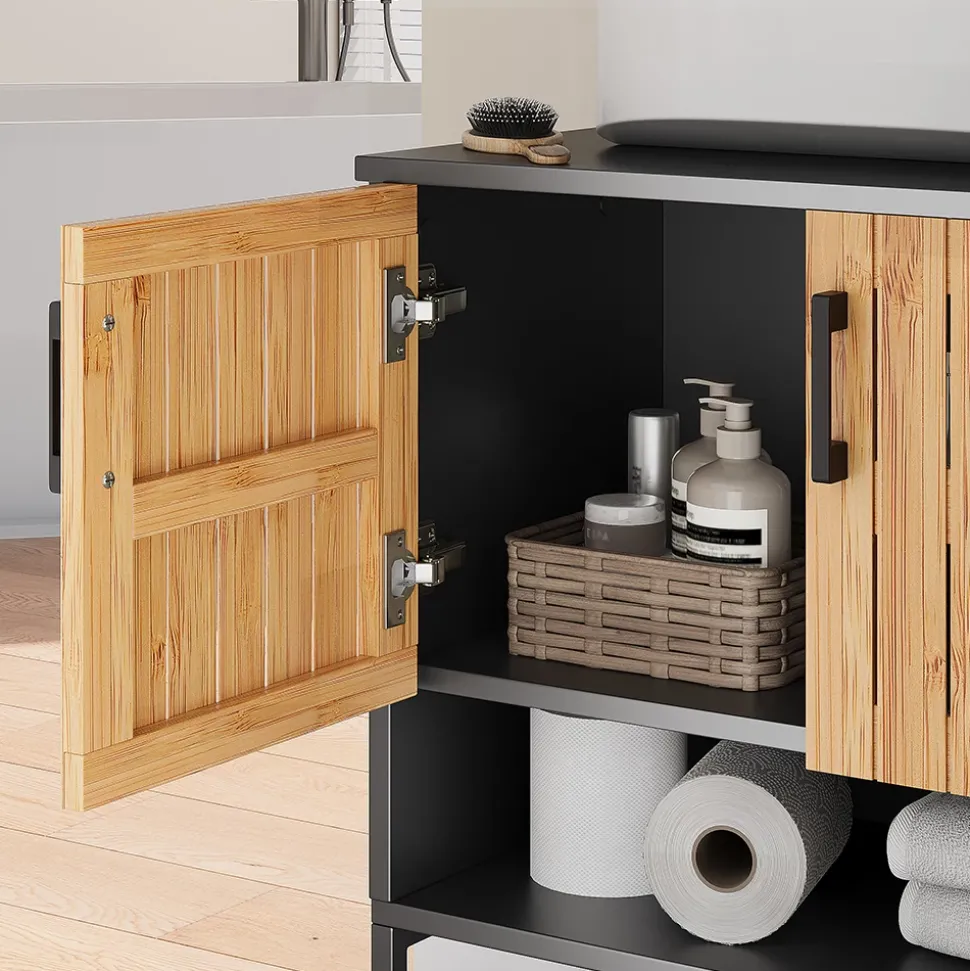 - MATERIAL: Das Badmöbel-Set besteht aus einer pflegeleichten MDF, 15 mm. Die Fronten sind aus lackiertem Bambus. Einige Bestandteile des Artikels sind aus Stahl, 16 mm gefertigt.