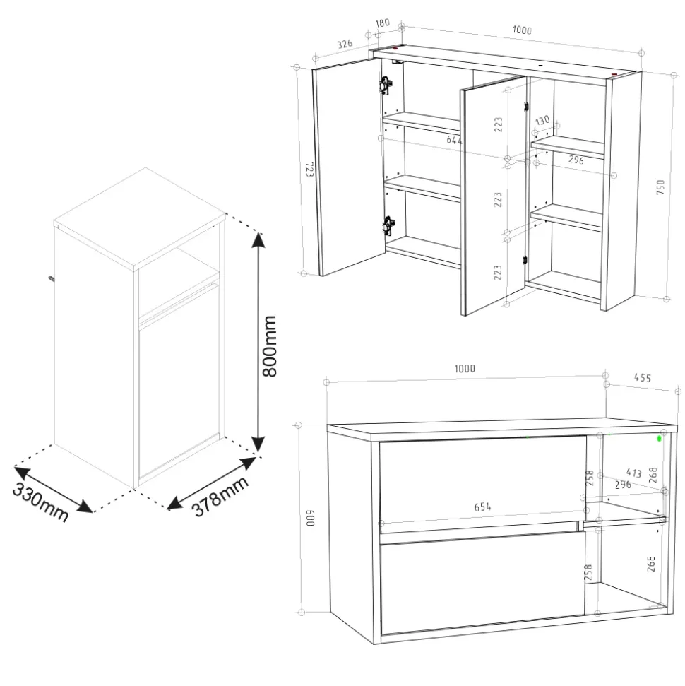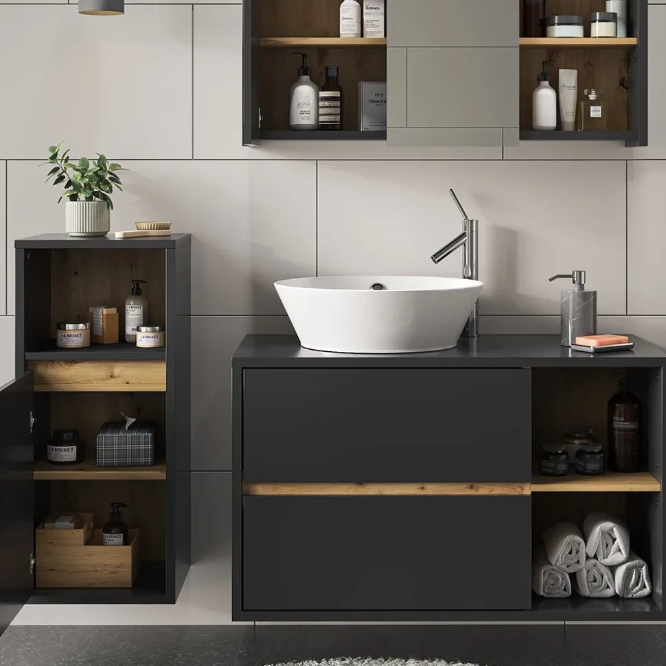 - LIEFERUMFANG: Badspiegelschrank, Waschbeckenunterschrank, Midischrank, Montageanleitung, Montagematerial.