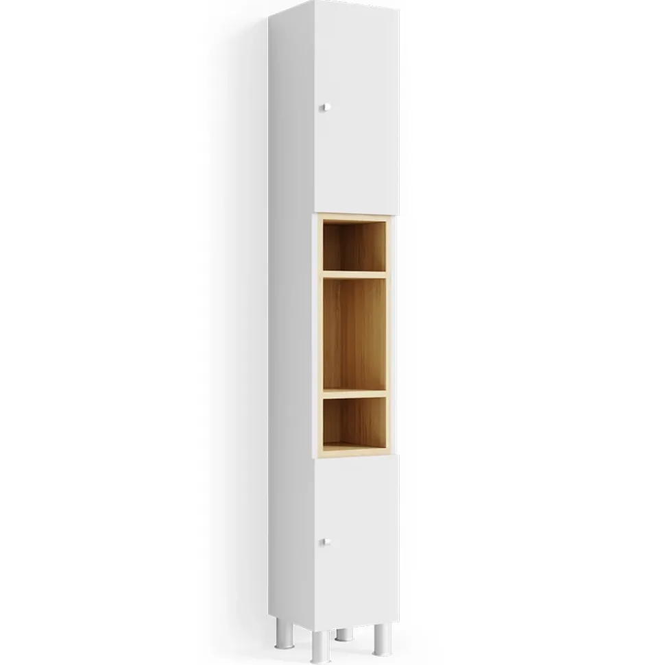 - Dieser Badezimmerhochschrank ist ideal für Ihr Zuhause. Er hat drei offene Ablagen, zwei Türen und insgesamt sieben Einlegeböden. Die Metallfüße machen ihn stabil und robust.