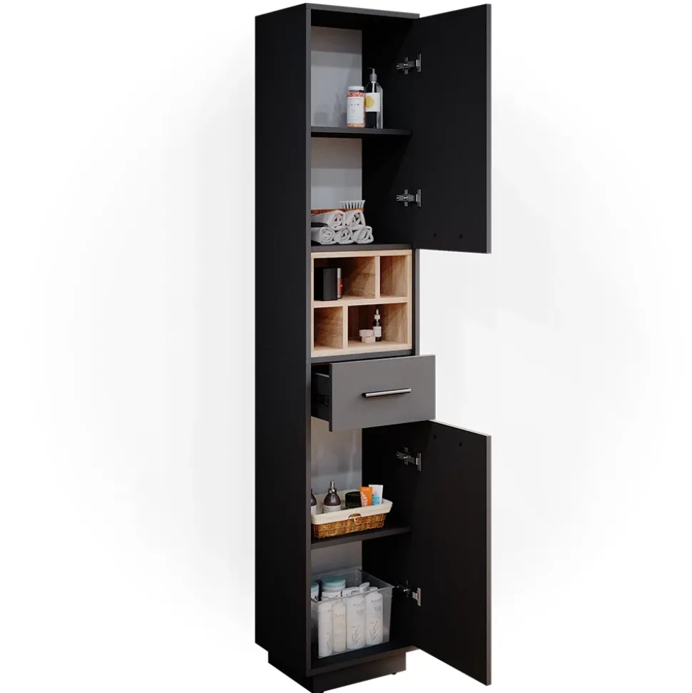 - Dieser Badezimmerhochschrank hat ein offenes Fach und zwei Türen, insgesamt 4 große und 4 kleine Einlegeböden. Die Schublade ist ausziehbar.
