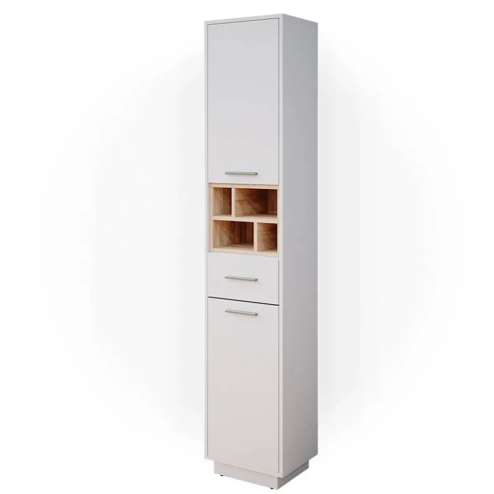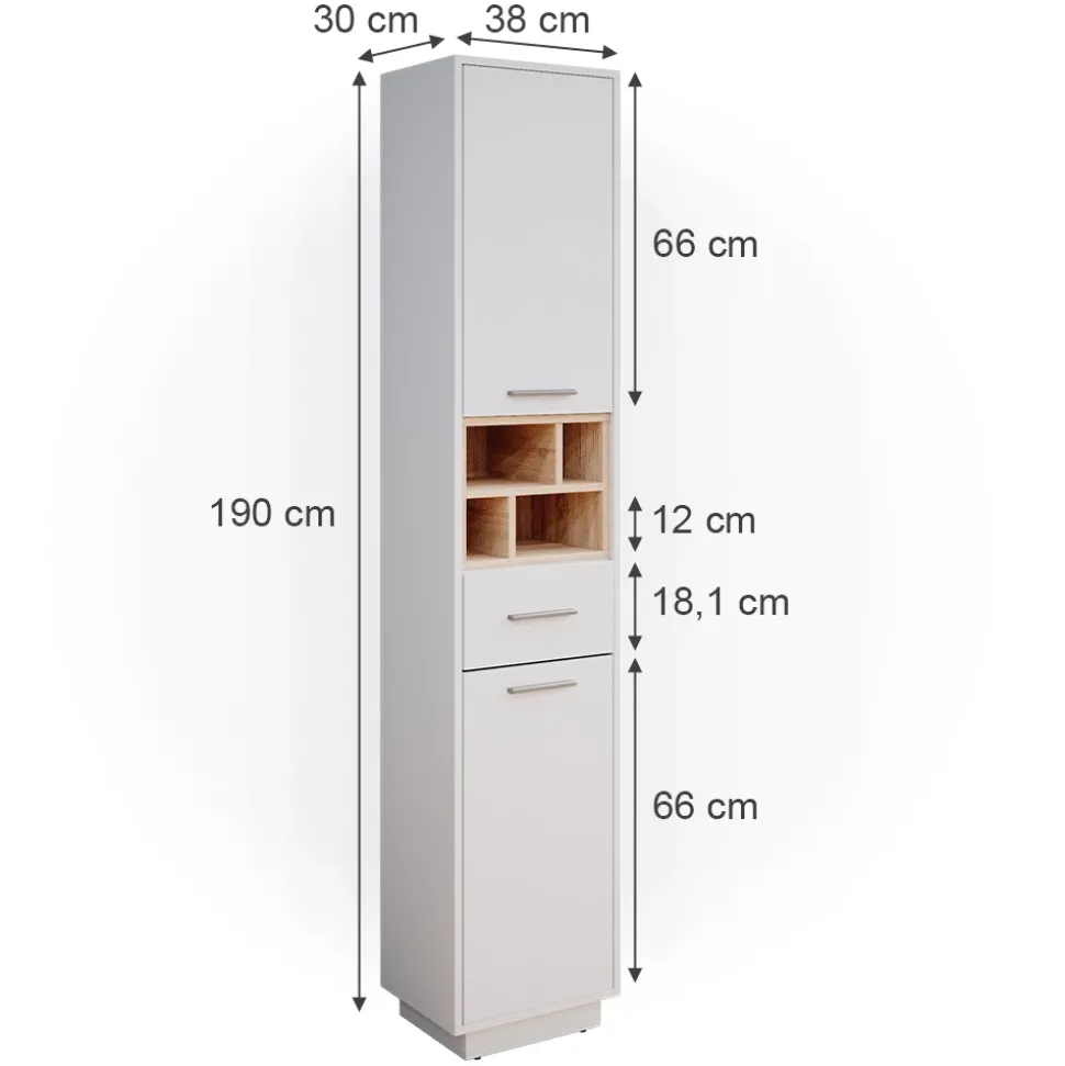 - Dieser Badezimmerhochschrank hat ein offenes Fach und zwei Türen, hinter denen sich vier große und vier kleine Ablagen befinden. Die Schublade ist ausziehbar.