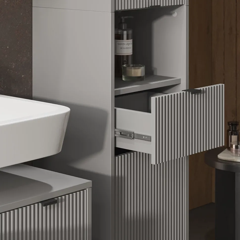 Als vollkommener Teil der Eliza-Serie bringt jedes Stück zeitlose Eleganz und bemerkenswerte Qualität in Ihr Badezimmer. Ein extravagantes, modernes Design mit markanten Fronten verleiht Ihrem Raum eine faszinierende Note der Raffinesse. Die mühelose Montage ermöglicht es Ihnen, den Schrank schnell und unkompliziert in Ihrer Einrichtung zu integrieren. Die pflegeleichte Oberfläche gewährleistet, dass Ihre elegante Einrichtung stets makellos bleibt – mit minimalem Aufwand für die Reinigung.