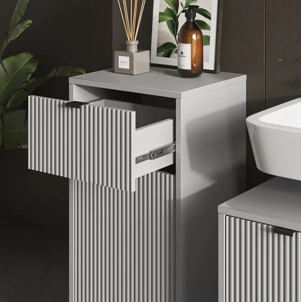 - Bereichern Sie Ihr Badezimmer mit dem Vicco Midischrank Eliza in stilvollem Grau. Ein schmaler Badschrank mit Tür und Schubfach für eine effiziente Badezimmerorganisation.