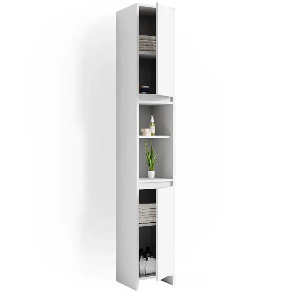 Der Badschrank Emma ist die perfekte Ergänzung für jedes minimalistische Badezimmer. Mit seinen zwei offenen Fächern und zwei Türen bietet er ausreichend Platz für Handtücher, Hygieneartikel und andere Badezimmerutensilien. Durch die Möglichkeit, die Richtung der Türöffnung umzukehren, kann er problemlos in jeder Ecke des Raumes platziert werden. Mit seinen sechs Einlegeböden bietet der Badschrank Emma viel Raum für eine geordnete Aufbewahrung und eine bessere Organisation Ihrer Dinge. Darüber hinaus ist er kompatibel mit anderen Produkten der Emma-Kollektion, um ein harmonisches und einheitliches Aussehen im Badezimmer zu erreichen. Dieser Badschrank ist nicht nur funktional, sondern auch ästhetisch ansprechend. Sein schlankes Design passt perfekt in jedes moderne Badezimmer und verleiht Ihrem Raum einen zeitgemäßen Charme. Ob als Wäscheschrank, Badezimmer Hochschrank oder schmaler Badezimmerschrank, der Badschrank Emma ist das ideale Möbelstück für ein ordentliches und stilvolles Badezimmer. Entscheiden Sie sich für Emma und erleben Sie die perfekte Kombination aus Funktionalität und Design.