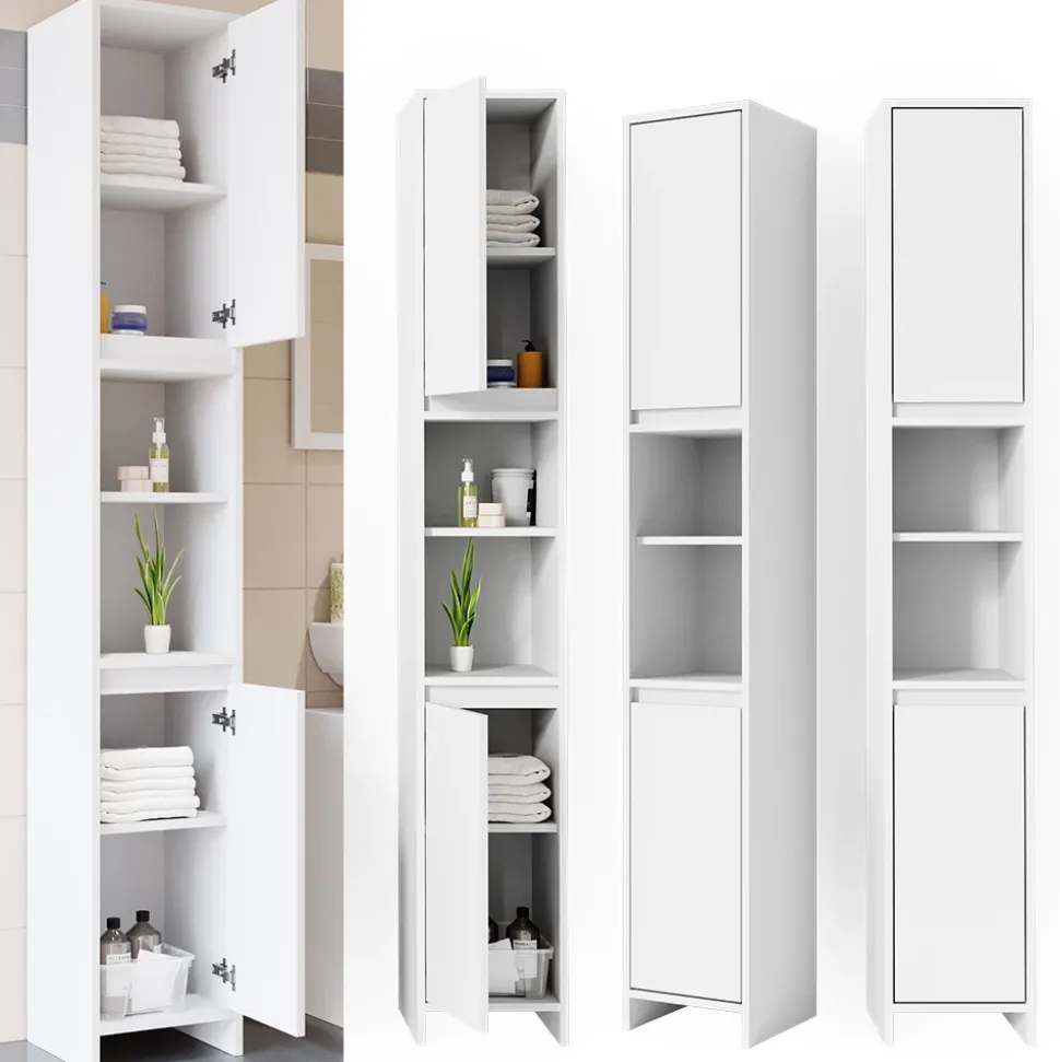 - Der Badezimmerhochschrank bietet mit seinen zwei offenen Fächern und zwei Türen viel Stauraum. Die Sechs Ablagen sorgen für Ordnung und Flexibilität.