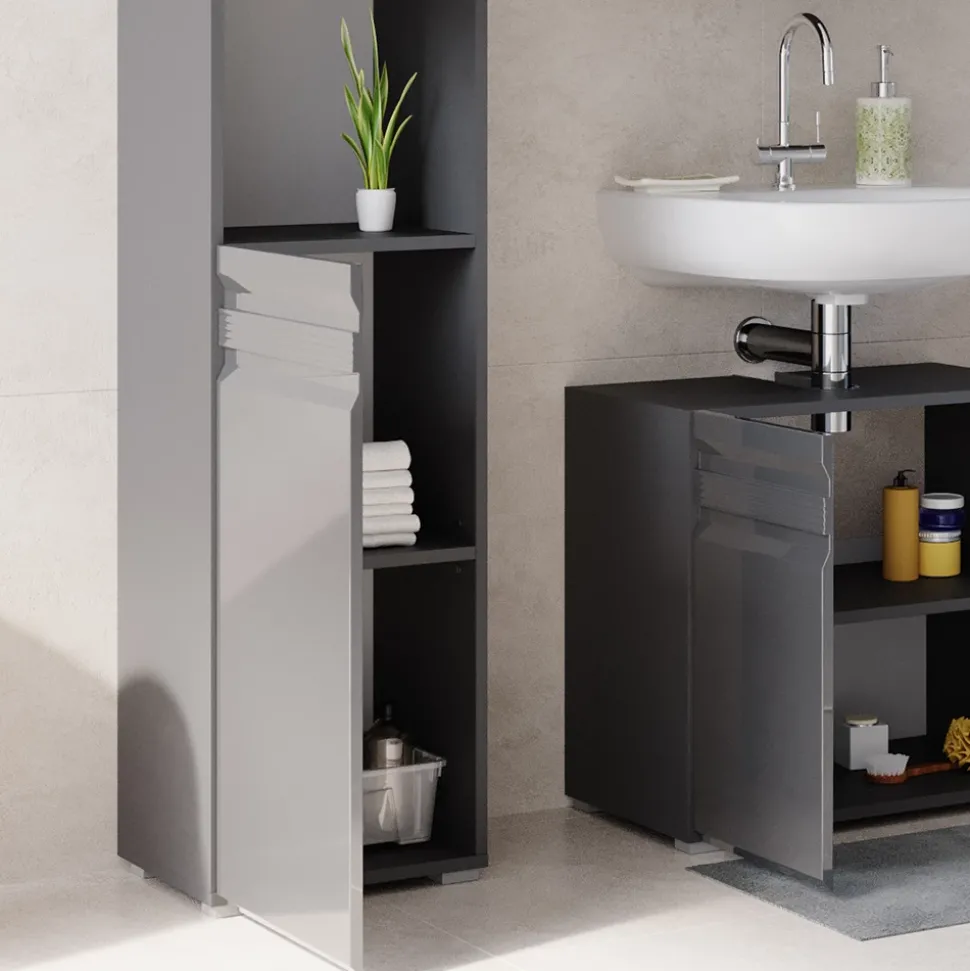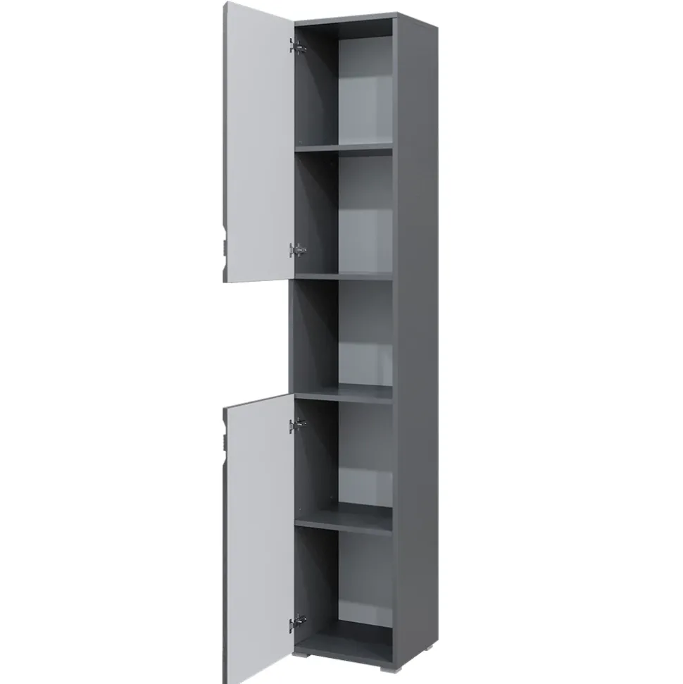 Der Badschrank Fredd ist die perfekte Ergänzung für jedes Badezimmer. Mit seinem originellen Design und der Grifflosen Front ist er nicht nur ein Blickfang, sondern bietet auch viel Stauraum für Ihre Badutensilien. Der Schrank verfügt über ein offenes Fach und zwei Türen, hinter denen sich insgesamt fünf Fächer befinden. Durch die hohe Kompatibilität mit anderen Artikeln der Fredd-Kollektion lässt sich der Schrank wunderbar in jedes Badezimmer integrieren. Dieser Badezimmer Hochschrank wird Ihnen viele Jahre Freude bereiten und Ihren Alltag erleichtern. Schaffen Sie sich ein schönes Bad mit Fredd!
