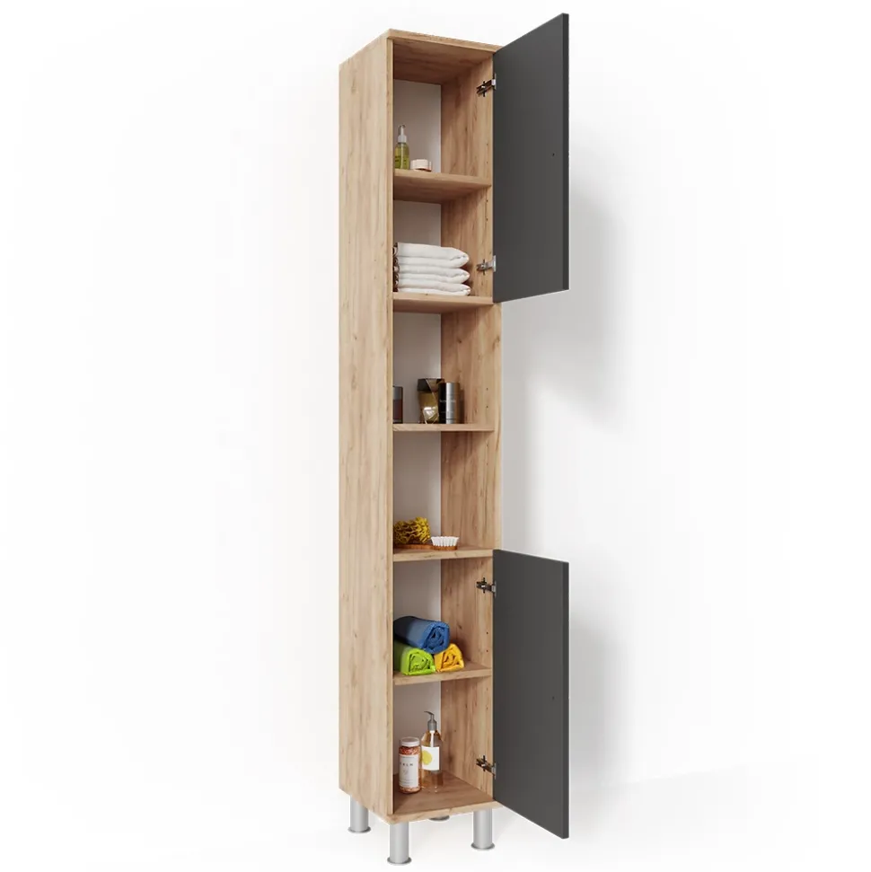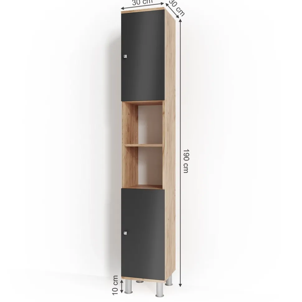 - Der Badezimmerhochschrank bietet viel Stauraum mit offenen und geschlossenen Ablagefächern. Alles ist stets griffbereit, dank der durchdachten Aufteilung.