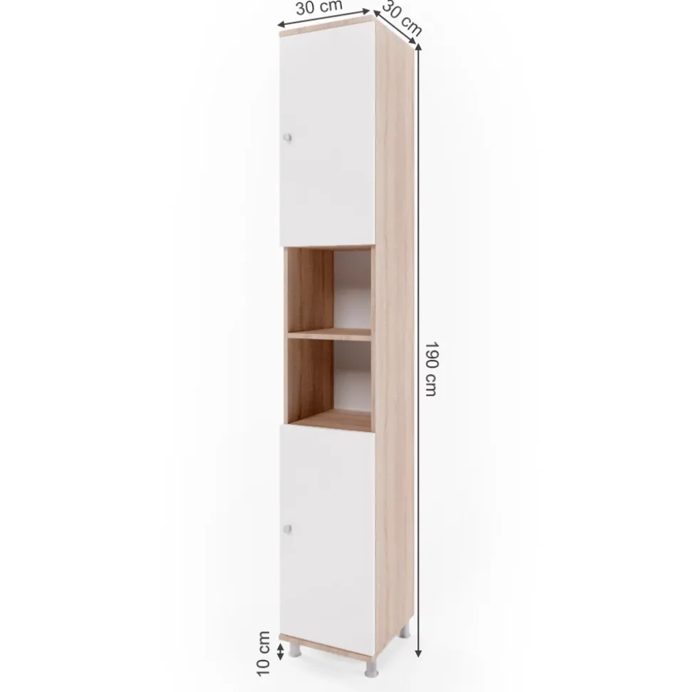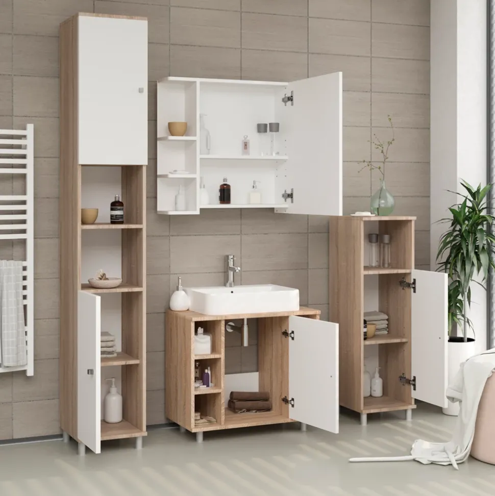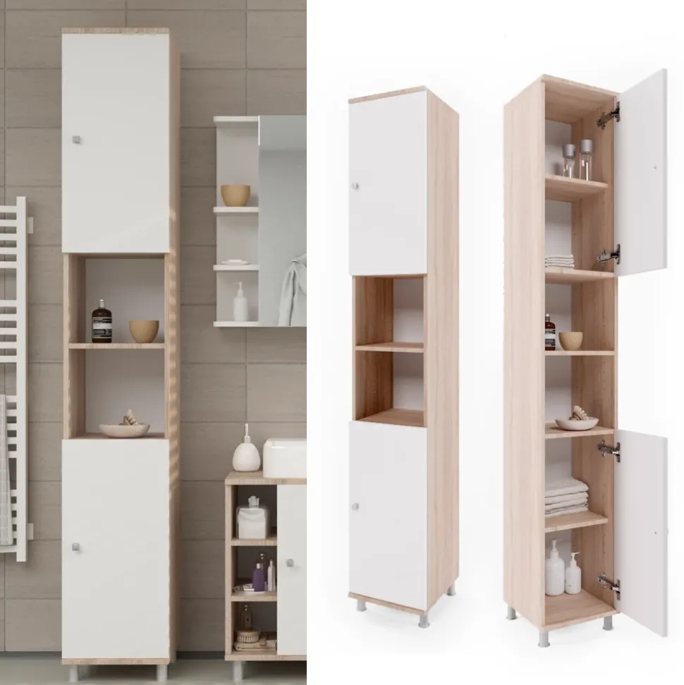 - Der Badezimmerhochschrank bietet viel Stauraum mit offenen und geschlossenen Ablagefächern. Alles ist stets griffbereit, dank der durchdachten Aufteilung.