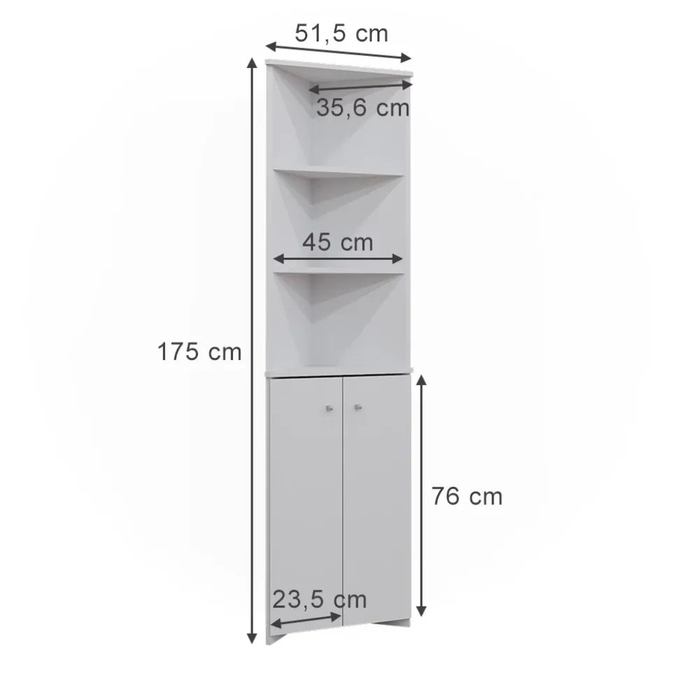 - MAßE: Der Eckschrank hat die folgenden Größen: Tiefe: 35,6 cm, Breite: 51,5 cm, Höhe: 175 cm. Alle detaillierten Größen sind auf den Fotos angegeben.