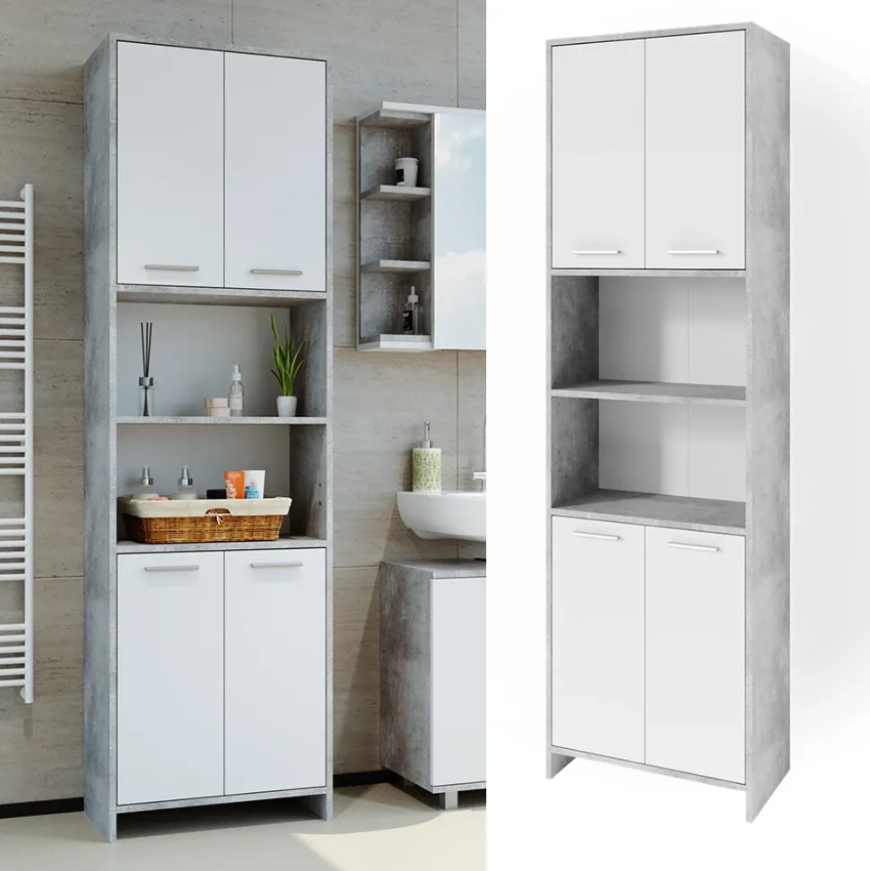 - Der Badezimmerhochschrank verfügt über zwei offene Ablagen und vier Türen mit sechs geschlossenen Regale für maximalen Stauraum.