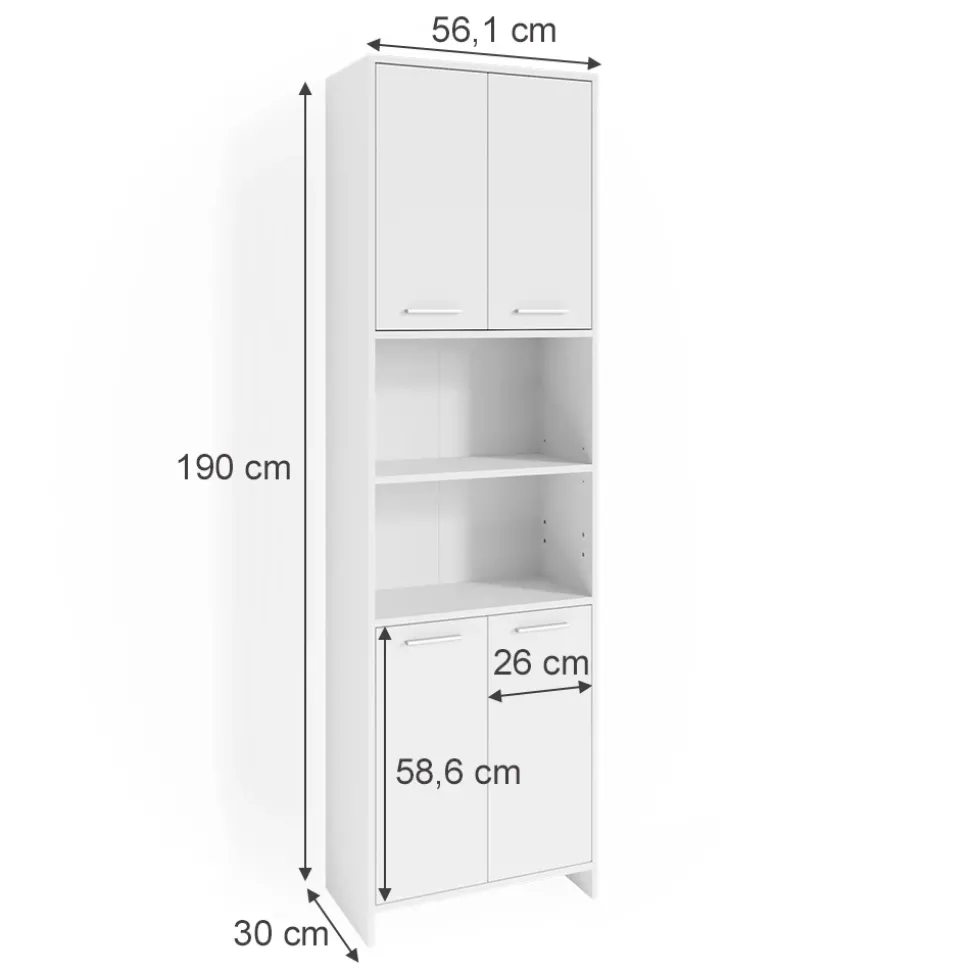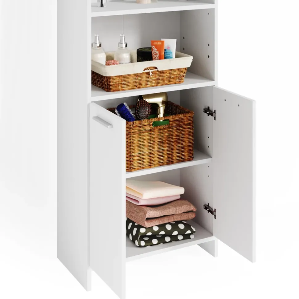 - Der Badezimmerhochschrank verfügt über zwei offene Ablagen und vier Türen mit sechs geschlossenen Regale für maximalen Stauraum.