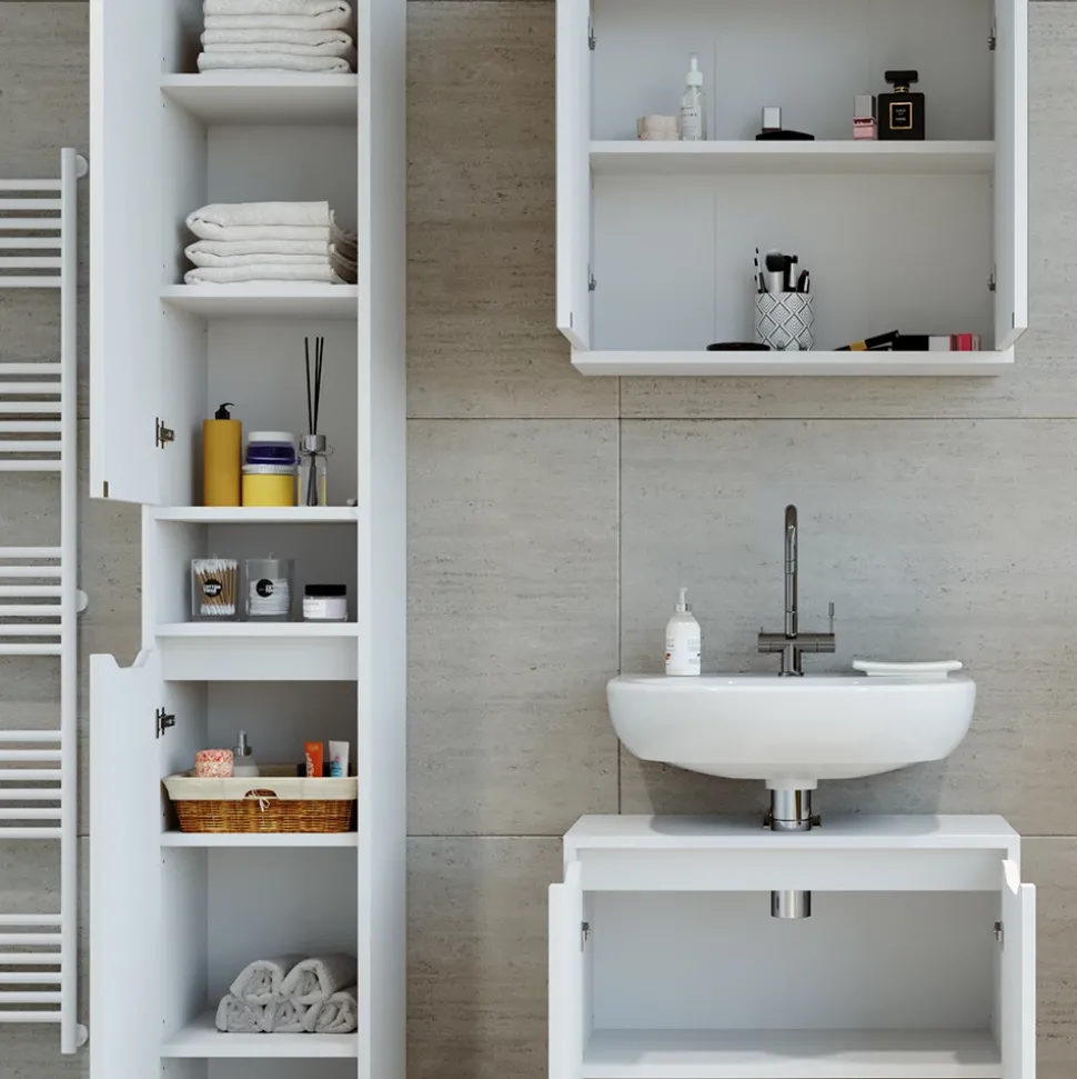 - Mit dem schmalen Badezimmerschrank „Ruben“ treffen Sie eine gute Entscheidung, dank seines optimierten Designs und seiner Universalität für jedes Haus.