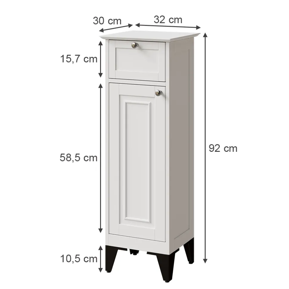 - MAßE: Die Badezimmermöbel, mit Schublade, hat folgende Maße: Tiefe: 30 cm, Breite: 32 cm, Höhe: 92 cm. Die detaillierten Größen sind auf den Fotos angegeben.