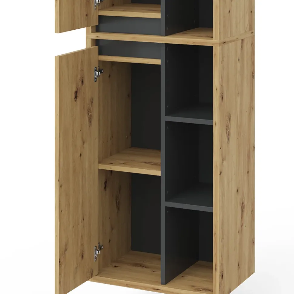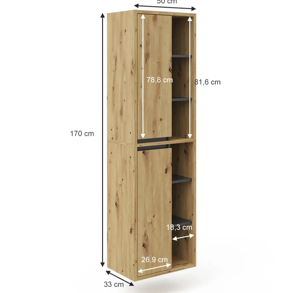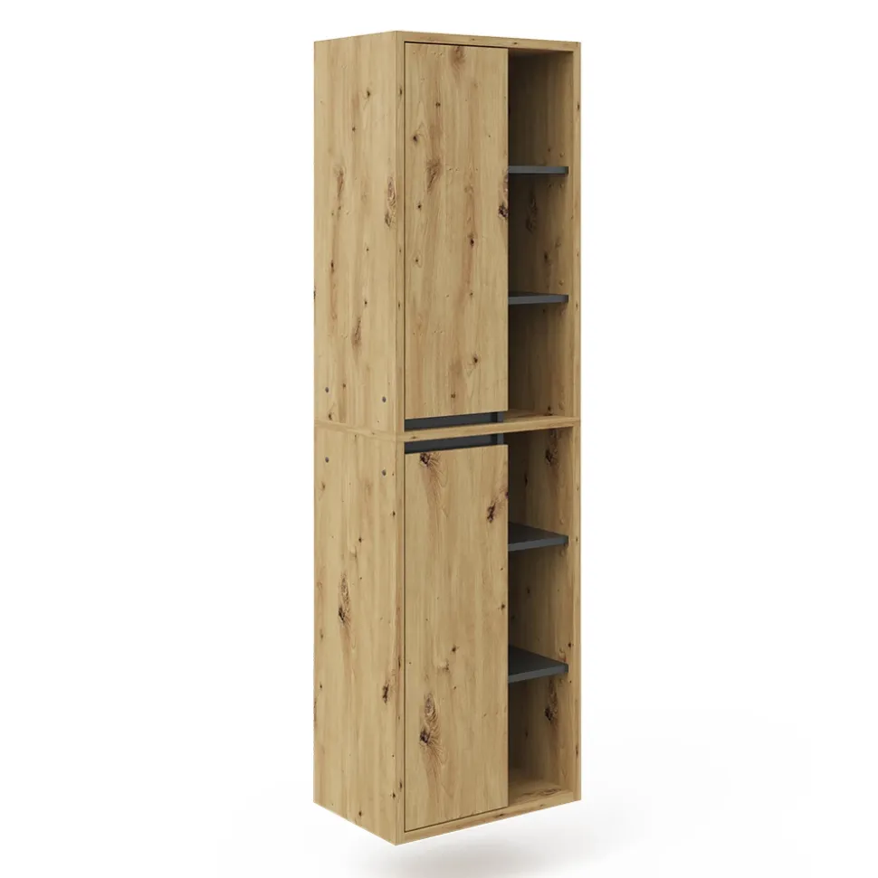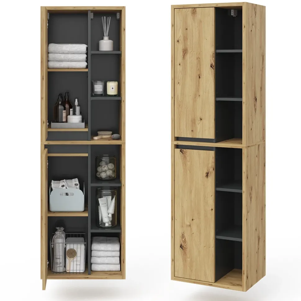 - Dieser Badezimmerhochschrank bietet zwei offene Ablagen und zwei Türen mit insgesamt 10 Einlegeböden. Er ist wandmontiert, um optimale Raumausnutzung zu erzielen.