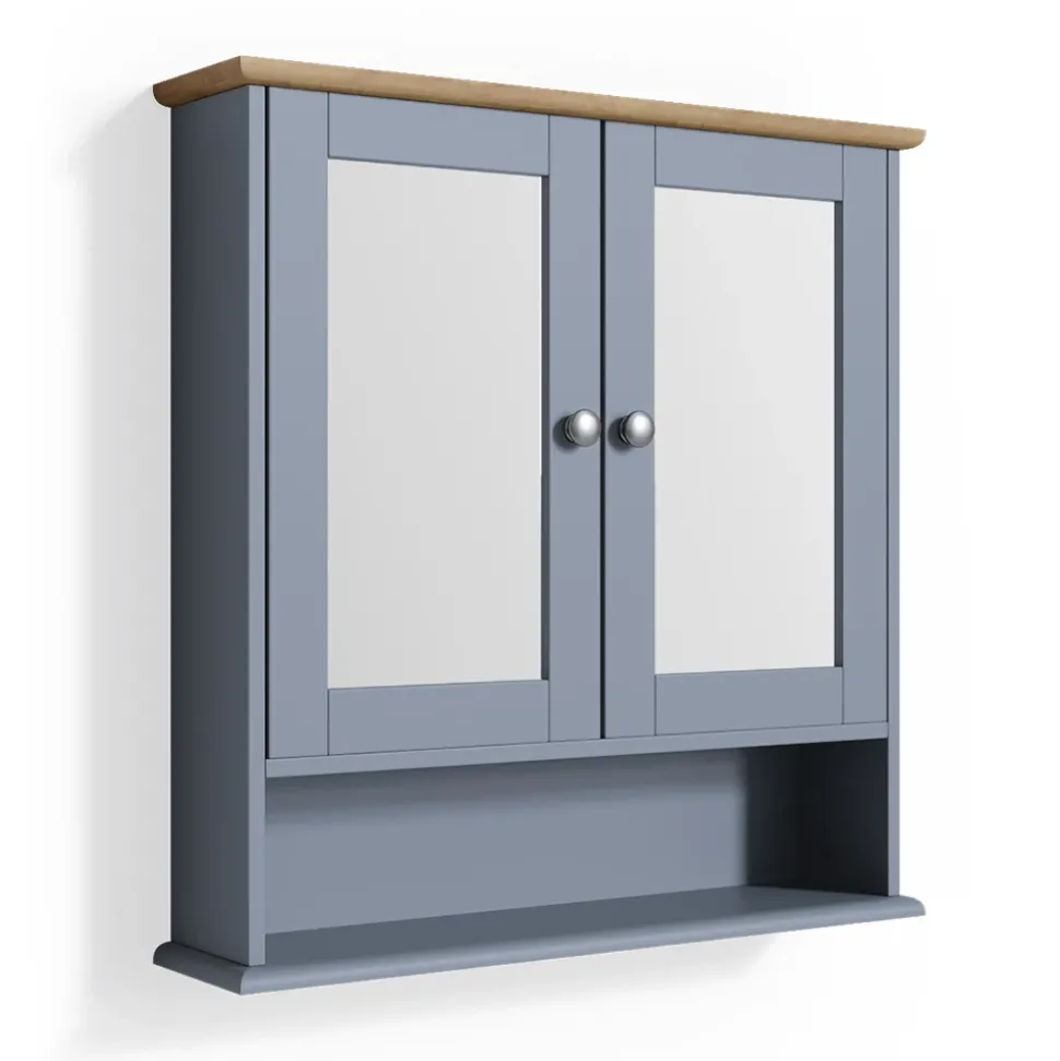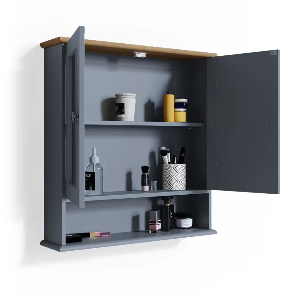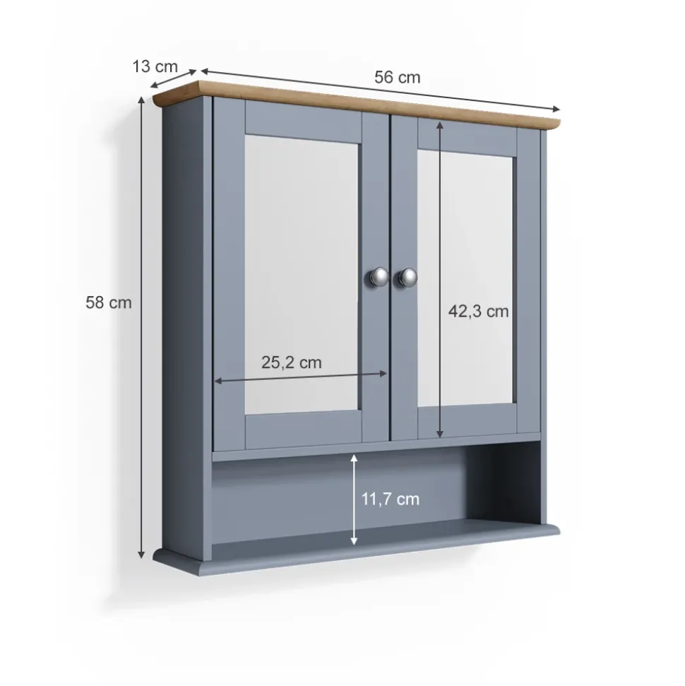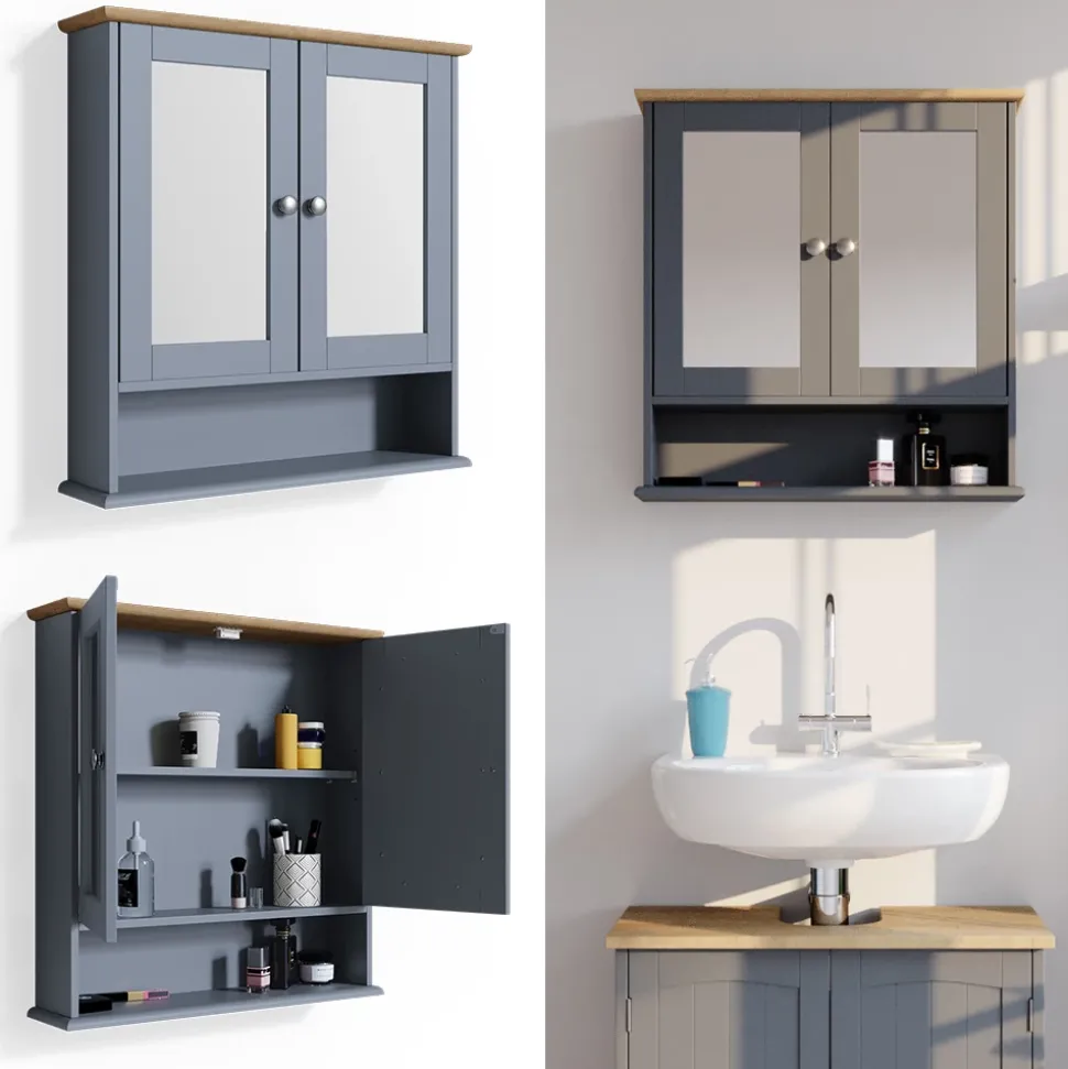 - Der Badezimmerspiegel ist ein zweitüriger Schrank mit Fächern und zwei inneren Ablageflächen. Er bietet viel Stauraum für Badezimmerutensilien.
