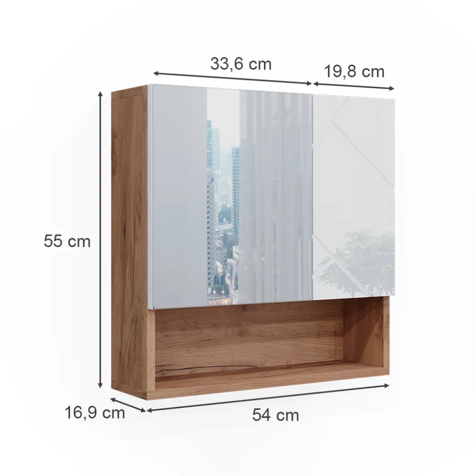 - MAßE: Der Badezimmerschrank mit Spiegel hat folgende Abmessungen: Breite: 54 cm, Höhe: 55 cm, Tiefe: 16,9 cm. Alle detaillierten Größen sind auf den Fotos angegeben.