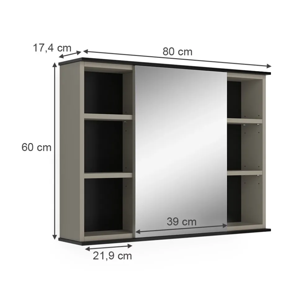 - MAßE: Der Badezimmerschrank mit Spiegel hat folgende Maße: Tiefe: 17,4 cm, Breite: 80 cm, Höhe: 60 cm.