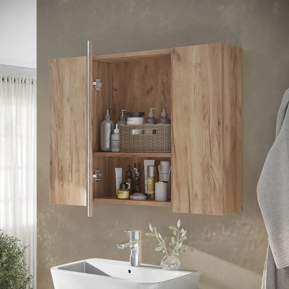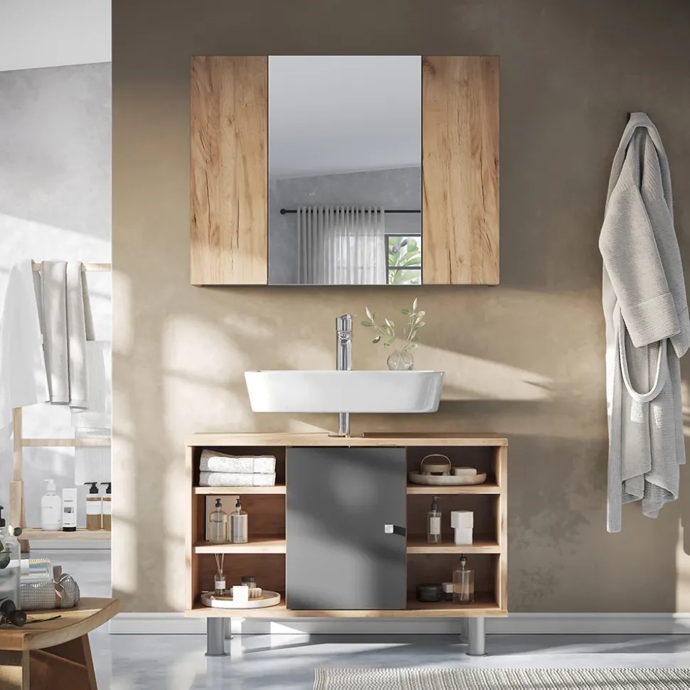 Die Möbelserie Leopold überzeugt durch ihre schlichte Eleganz und hohe Funktionalität. Der Spiegelschrank bietet praktischen Stauraum und verleiht dem Raum eine moderne Note.