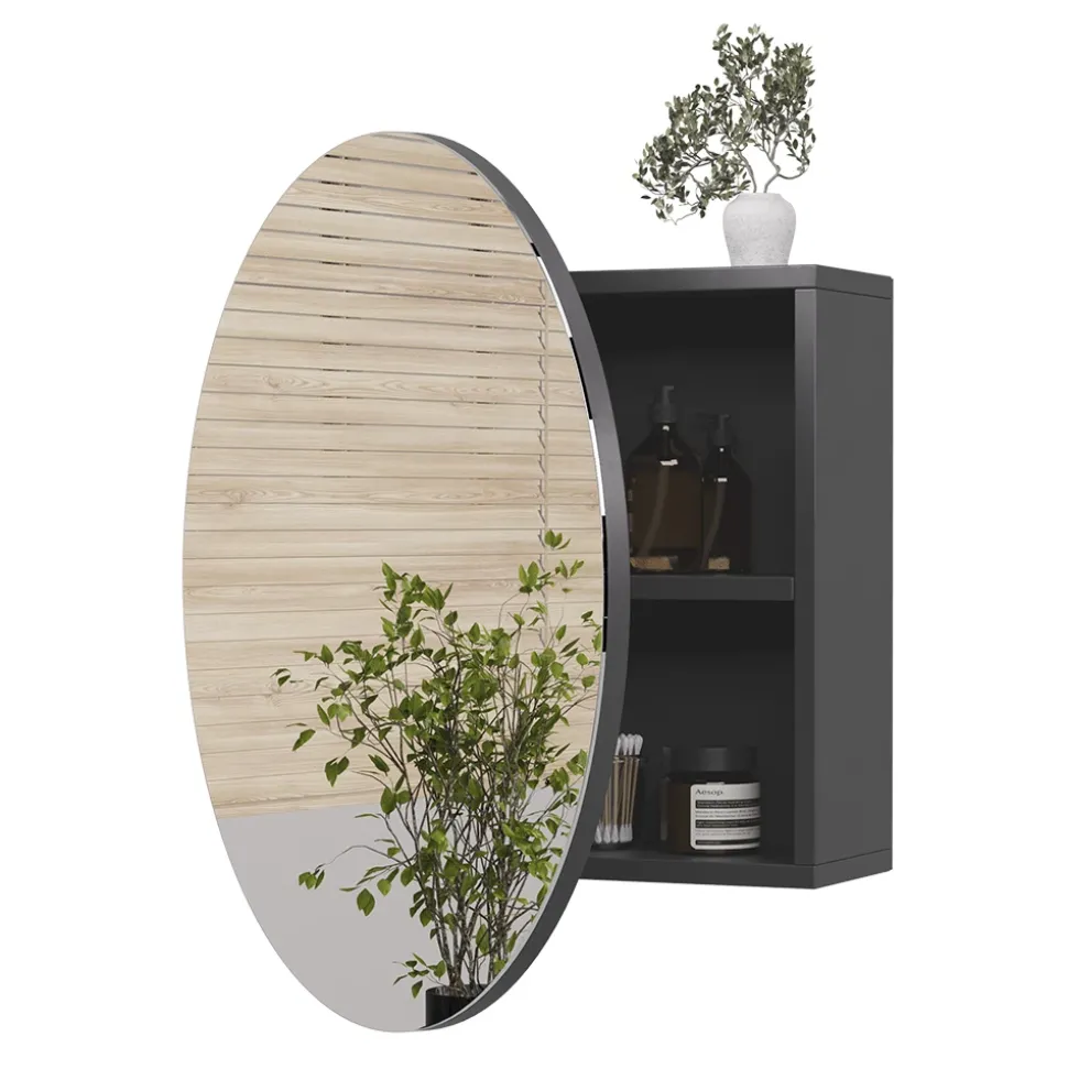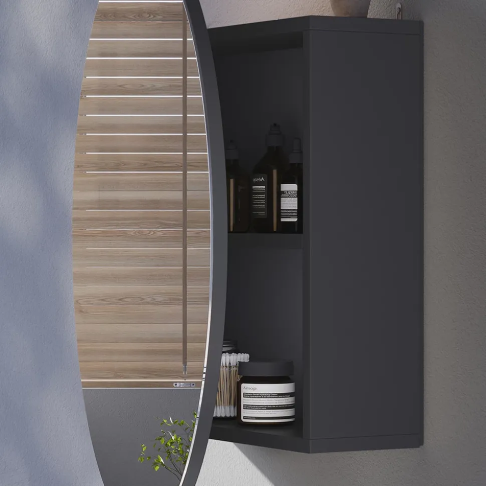 Der Spiegelschrank Loki überzeugt mit seinem modernen, runden Design und einer eleganten Antik-Optik. Er bietet nicht nur stilvolle Aufbewahrung, sondern setzt auch einen dekorativen Akzent im Badezimmer.