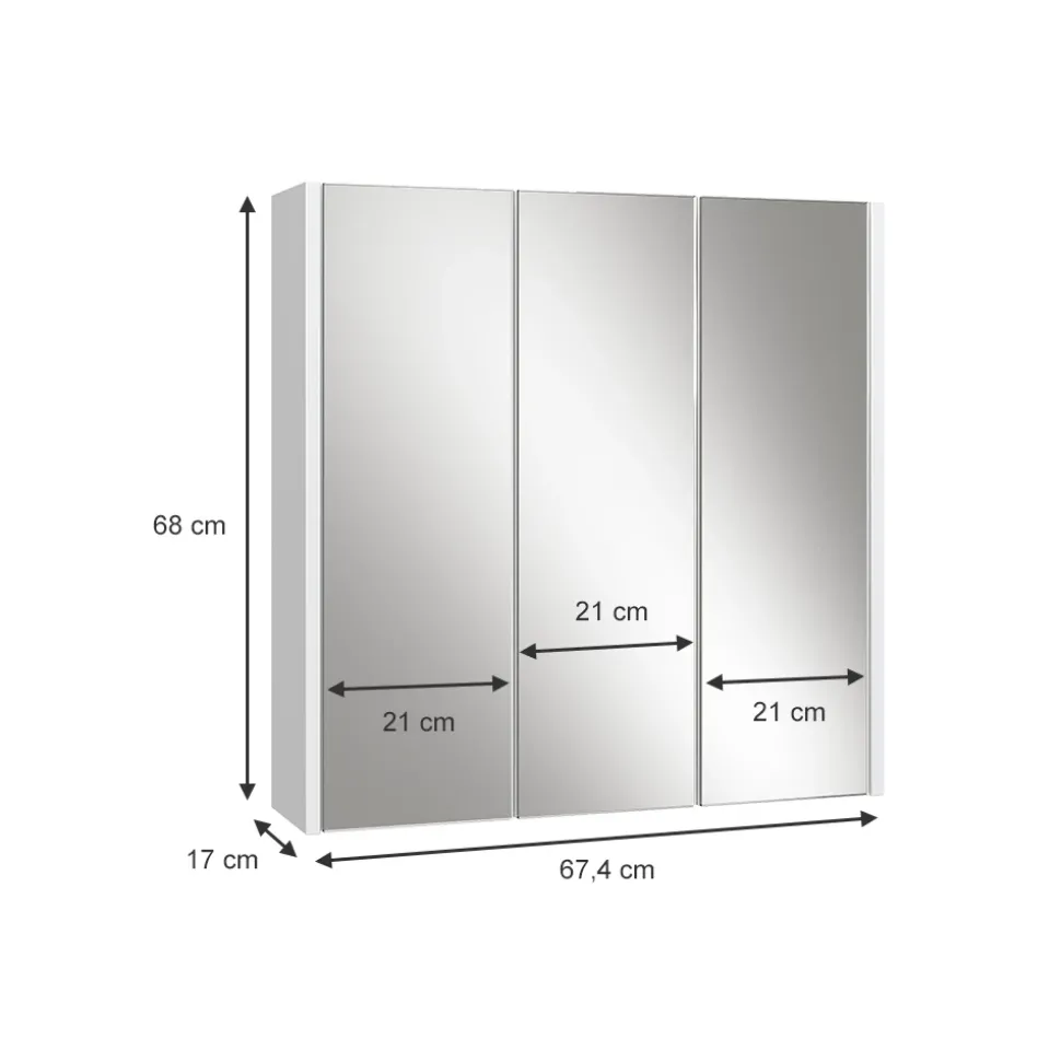 - MAßE: Der Badezimmerschrank mit Spiegel hat folgende Abmessungen: Breite: 67,4 cm, Höhe: 68 cm, Tiefe: 17 cm. Alle detaillierten Größen sind auf den Fotos angegeben.