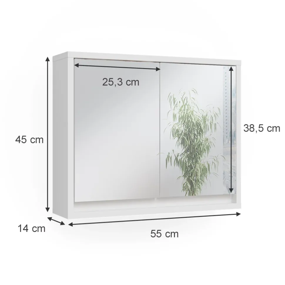 - MAßE: Der Badezimmerschrank mit Spiegel hat eine Breite von 55 cm, eine Höhe von 45 cm und eine Tiefe von 14 cm. Alle detaillierten Größen sind auf den Fotos angegeben.