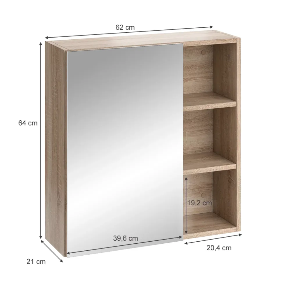 - MAßE: Der Badezimmerschrank mit Spiegel hat eine Breite von 62 cm, eine Höhe von 64 cm und eine Tiefe von 21 cm. Alle detaillierten Größen sind auf den Fotos angegeben.