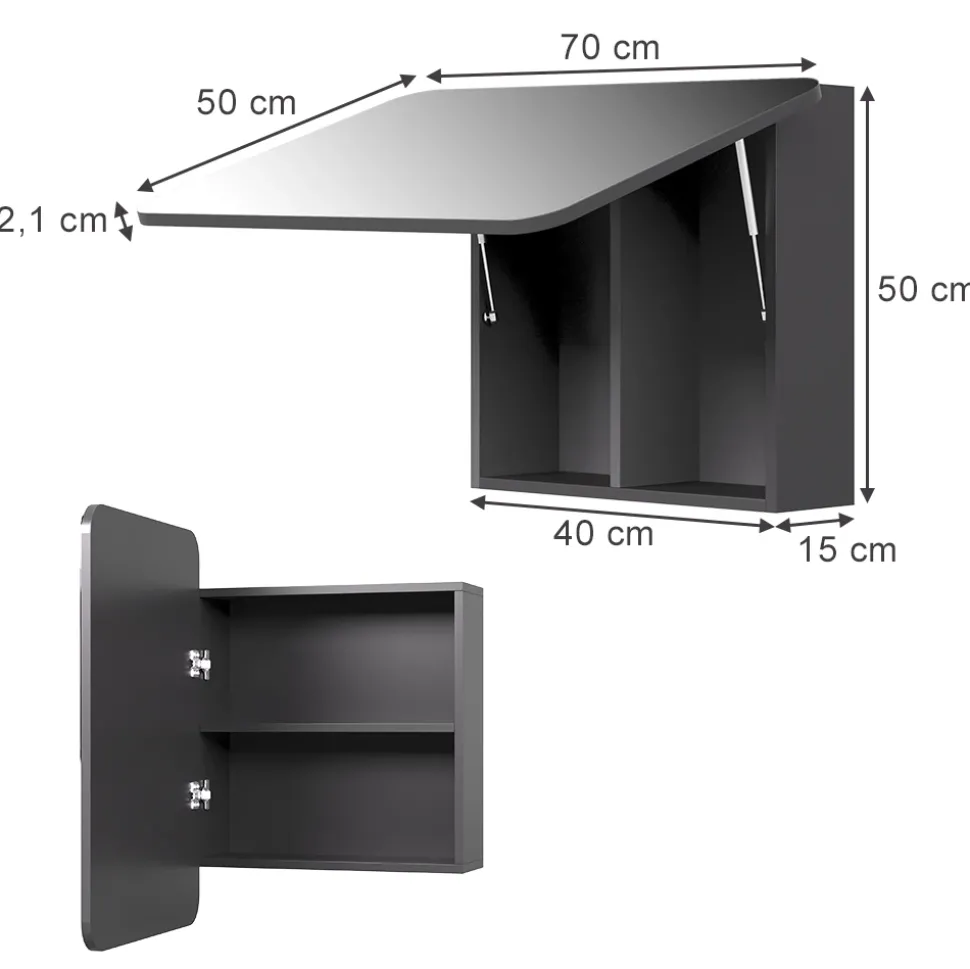 - MAßE: Der Badezimmerschrank mit Spiegel, mit Regalen, hat folgende Maße: Tiefe: 17,4 cm, Breite: 70 cm, Höhe: 50 cm. Die detaillierten Größen sind auf den Fotos ersichtlich.