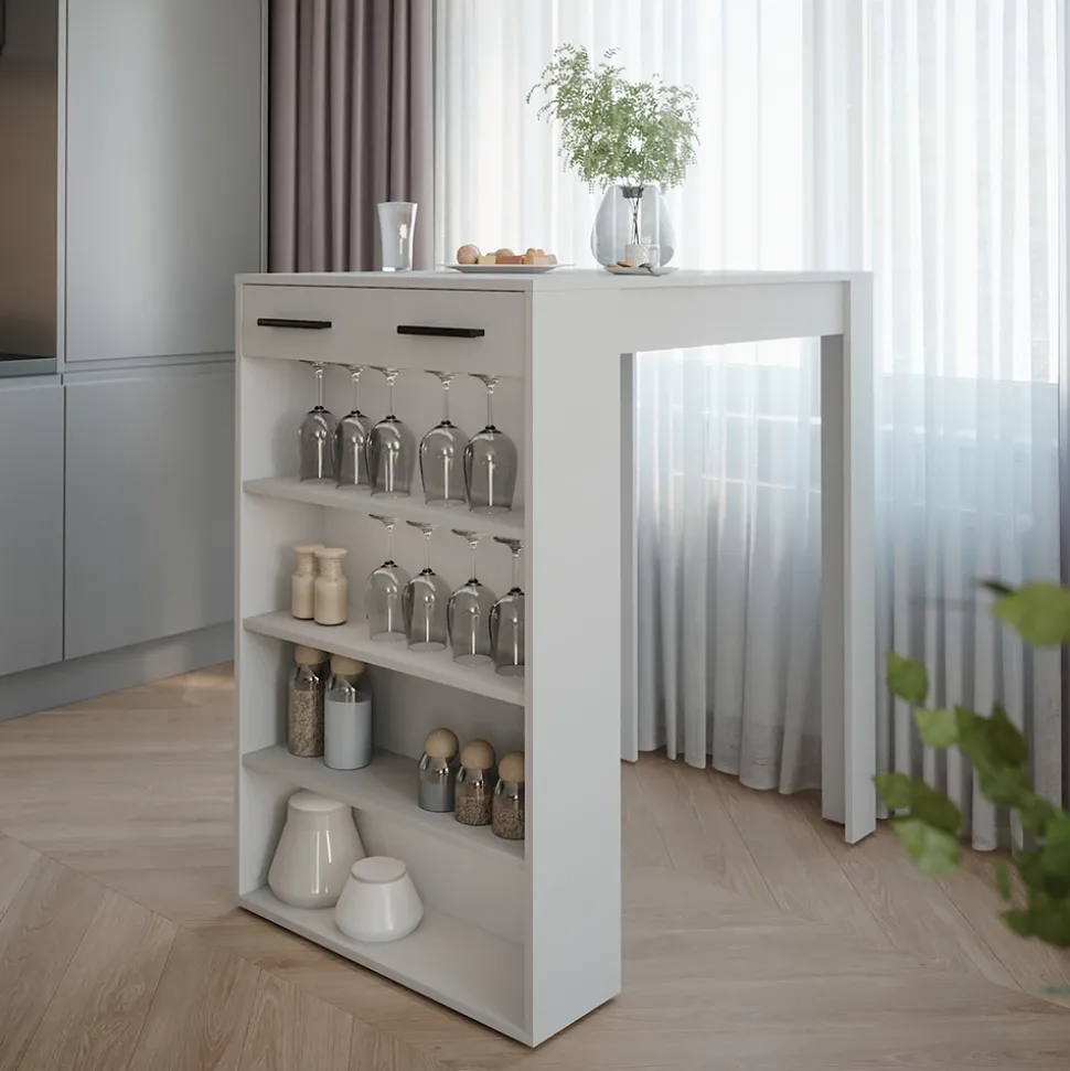 Der Bartisch Repose ist weit mehr als nur ein praktisches Möbelstück für Ihre Küche oder Ihr Esszimmer – er wird zum stilvollen Blickfang in Ihrer Einrichtung. Mit seinem eleganten Design und der vielseitigen Verwendbarkeit als Stehtisch, Bartresen oder Bistrotisch verbindet er modernes Design mit wohnlicher Atmosphäre. Besonders überzeugend sind die durchdachten Details: Ein integriertes Regal und eine Schublade bieten praktischen Stauraum, während die verstellbaren Einlegeböden individuelle Anpassungen ganz nach Ihren Bedürfnissen ermöglichen. Mit dem Bartisch Repose schaffen Sie einen Ort zum Genießen, Entspannen und für geselliges Beisammensein. Gönnen Sie sich dieses hochwertige Möbelstück und machen Sie Ihr Zuhause zu einem Ort, an dem Sie sich rundum wohlfühlen.