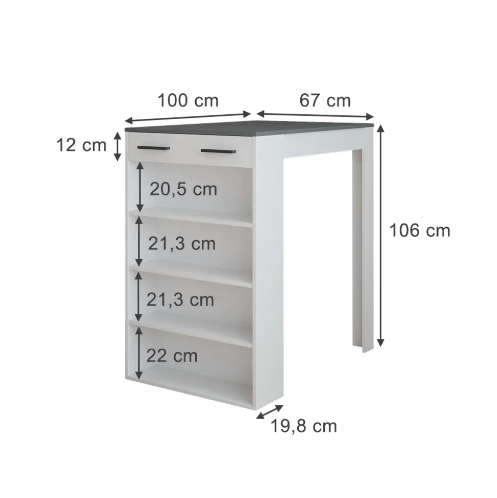 Der Bartisch Repose ist nicht nur ein praktisches Möbelstück für Ihre Küche oder Ihr Esszimmer, sondern auch ein stilvolles Highlight in Ihrer Einrichtung. Mit seinem eleganten Design und den vielseitigen Einsatzmöglichkeiten – ob als Stehtisch, Bartresen oder Bistrotisch – bringt er modernen Stil und wohnliche Gemütlichkeit in Ihren Alltag. Besonders praktisch sind die durchdachten Details: Ein integriertes Regal und eine Schublade bieten zusätzlichen Stauraum für Gläser, Flaschen oder andere Utensilien. Drei verstellbare Einlegeböden ermöglichen eine flexible Nutzung ganz nach Ihren Bedürfnissen.
