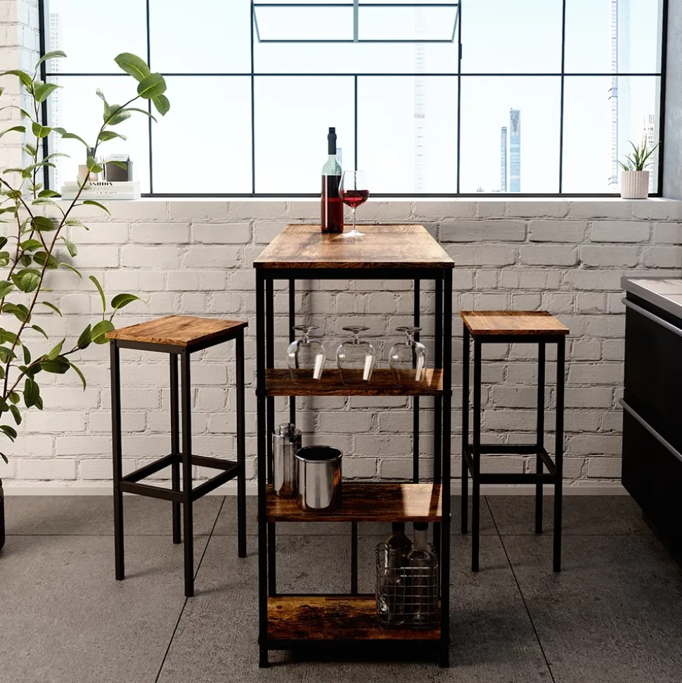 Mit dem Bartisch Set Fyrk machen Sie Ihre Küche zu einem stilvollen Bistro-Lokal! Das Set besteht aus einem Stehtisch mit eleganten Barhockern sowie einem praktischen Regal für Gläser und Flaschen. Der Loft-Stil des Tresens und der Hocker aus Metall verleihen Ihrem Zuhause das gewisse Etwas und machen das Set zu einem wahren Blickfang. Dank seiner robusten Verarbeitung ist das Bartisch Set Fyrk nicht nur optisch ein Highlight, sondern auch funktional perfekt. Ob für gemütliche Abende mit Freunden oder als Treffpunkt bei Familienfeiern – mit diesem Set haben Sie immer eine perfekte Lösung parat. Holen Sie sich jetzt das Bartisch Set Fyrk und genießen Sie das entspannte Bistro-Feeling in Ihrem Zuhause!