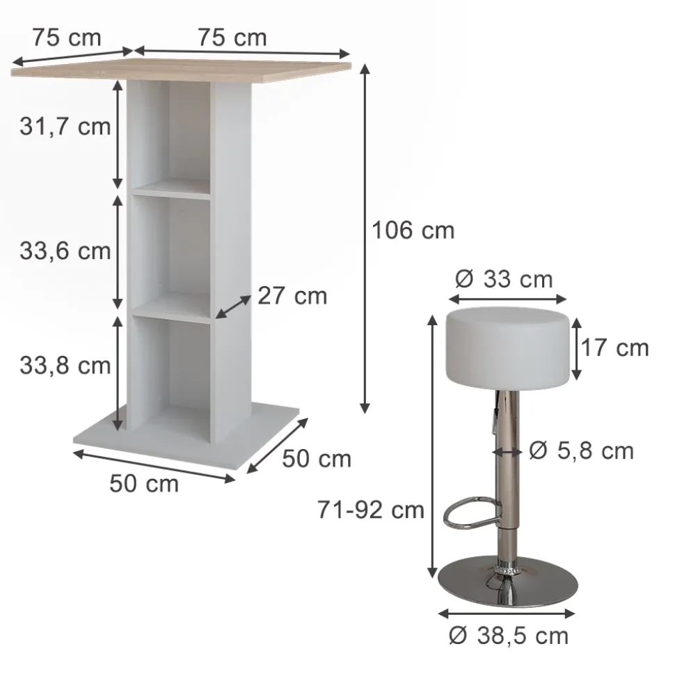 - MAßE: Der Stehtisch für die Küche misst 75 cm in der Tiefe, 75 cm in der Breite und 106 cm in der Höhe.