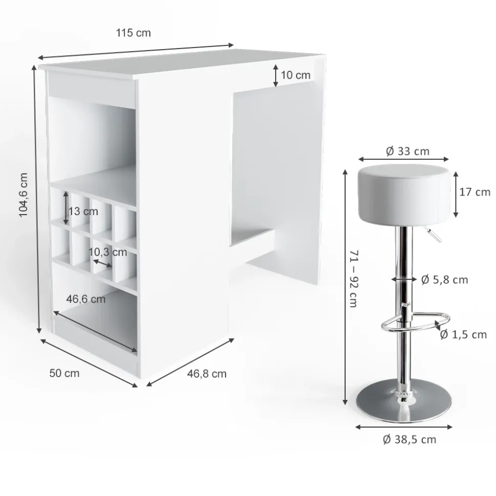 Der Bartisch Set „Ross“ mit 2 Barhockern ist das perfekte Möbelstück, um eine gemütliche und gesellige Atmosphäre in Ihrer Küche oder Ihrem Wohnzimmer zu schaffen. Das funktionelle Design des Stehtischs mit integrierten offenen Flaschenfächern und dem praktischen Regal bietet ausreichend Stauraum für Ihre Getränke und Gläser. Zusammen mit den beiden hochwertigen Barhockern ist dieses Bistrotisch-Set die perfekte Lösung für entspannte Abende mit Freunden und Familie. Lassen Sie sich von diesem wunderschönen Bartisch Set inspirieren und bringen Sie ein Stück Bar-Feeling in Ihre eigenen vier Wände.