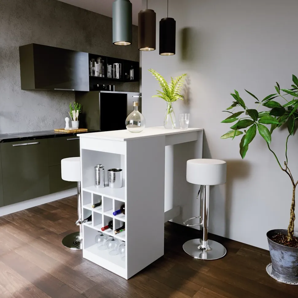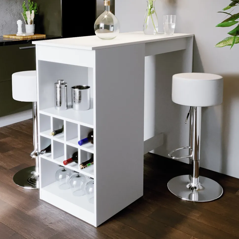 - Der Bartresen und Hocker sind eine funktionelle und geräumige Lösung für die Küche, mit offenen Flaschenfächern für einen schnellen Zugriff auf Getränke.