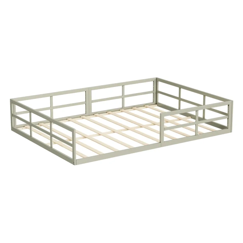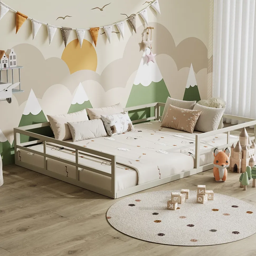 Das Kinderzimmerbett aus Metall ist als Bodenbett konzipiert und unterstützt nach Montessori-Prinzipien das selbstständige Ein- und Aussteigen Ihres Kindes. Der stabile Metallrahmen gewährleistet eine sichere Nutzung, während der integrierte Rausfallschutz für ungestörten Schlaf sorgt. Das Bett ist in verschiedenen Größen erhältlich, sodass Sie die passende Variante für Ihr Kinderzimmer wählen können. Es schafft einen komfortablen Schlafplatz und sorgt Tag für Tag für Geborgenheit.