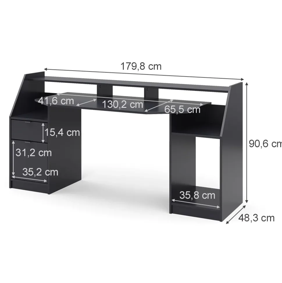 - MAßE: Der Gaming Schreibtisch hat eine Breite von 179,8 cm, eine Höhe von 90,6 cm und eine Tiefe von 65,5 cm. Alle detaillierten Größen sind auf den Fotos angegeben.