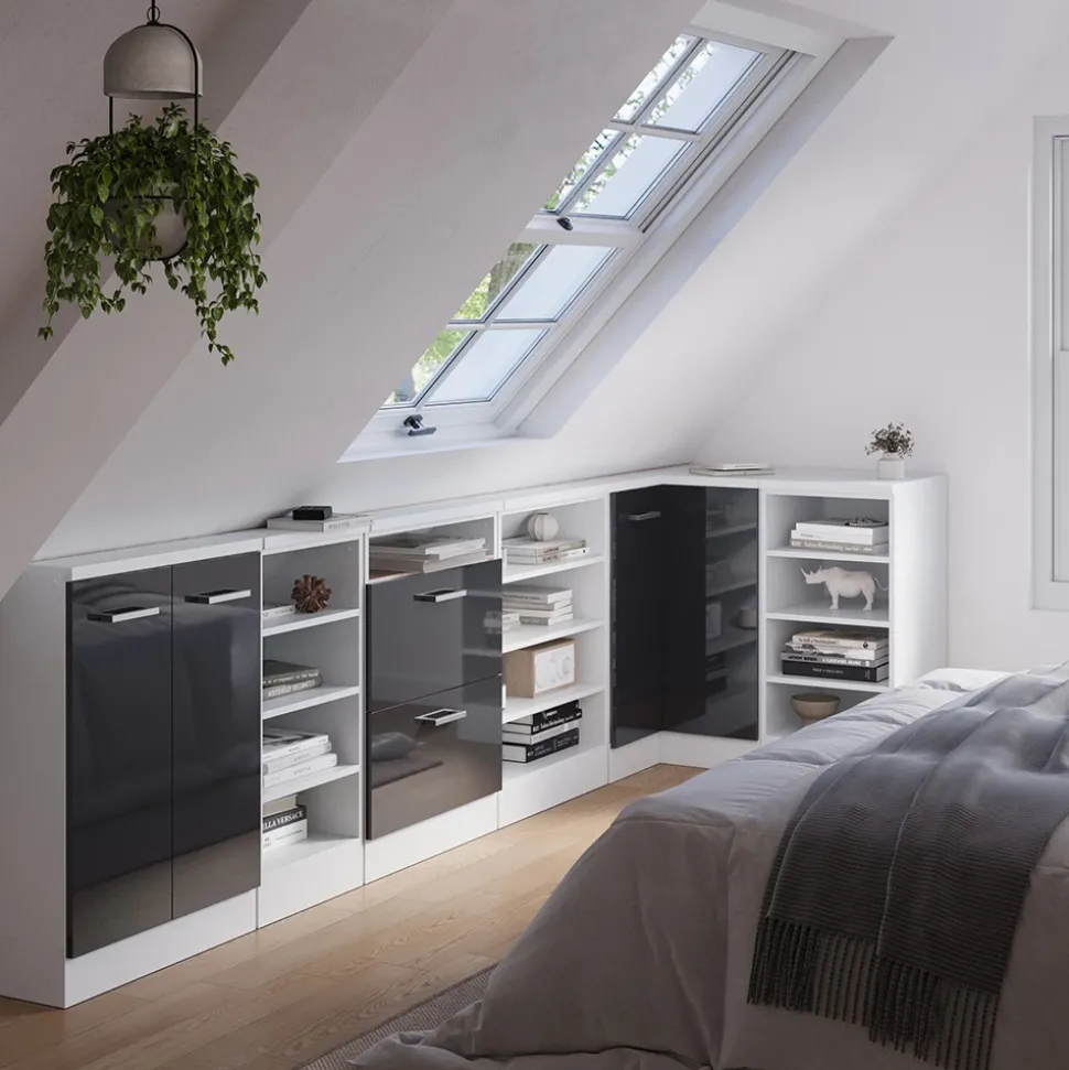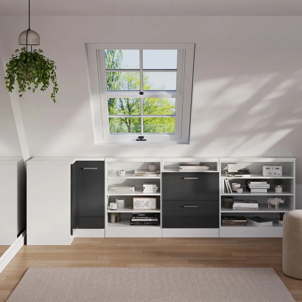 - Die Dachschrägenmöbel Rion sind die ideale Lösung, um ungenutzten Raum unter dem Dach optimal zu nutzen. Sie ermöglichen eine durchdachte und effiziente Gestaltung des vorhandenen Platzes.