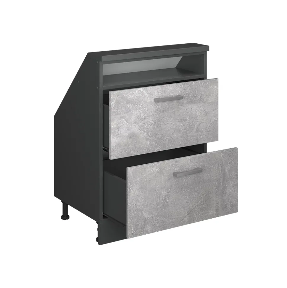 Der Dachschrägenschrank Rion ist die perfekte Lösung für alle, die ihre Dachschrägen optimal nutzen möchten. Mit zwei ausziehbaren Schubladen und einem offenen oberen Fach bietet er großzügigen Stauraum für Kleidung und andere Alltagsgegenstände. Die robuste Konstruktion und die schräge Oberseite machen ihn zu einem stabilen und stilvollen Möbelstück. Die versteckten Füße sorgen für einen sicheren Stand und ein elegantes Gesamtbild.
