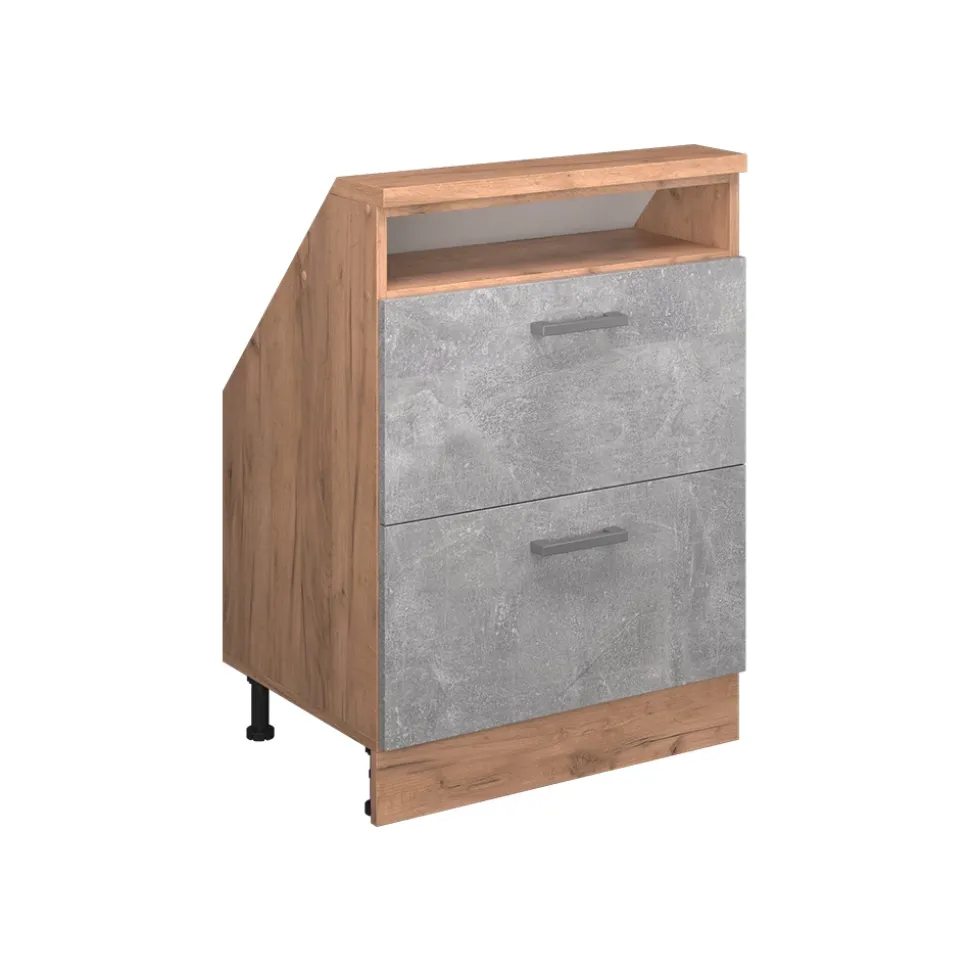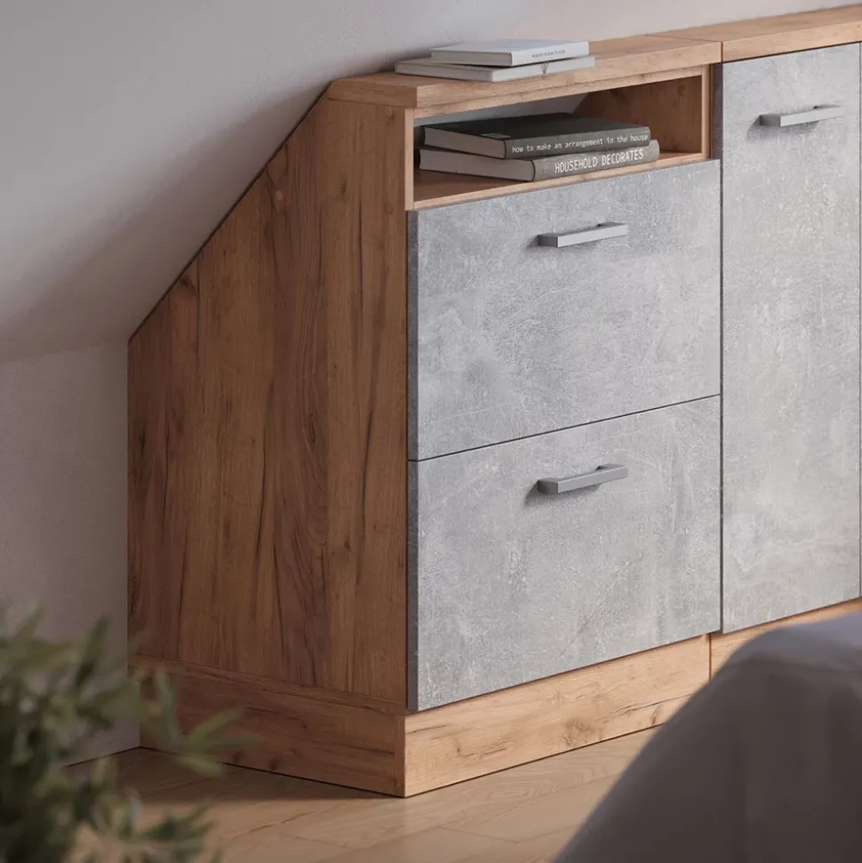 Der Dachschrägenschrank Rion ist die perfekte Lösung für alle, die ihre Dachschrägen optimal nutzen möchten. Mit zwei ausziehbaren Schubladen und einem offenen oberen Fach bietet er großzügigen Stauraum für Kleidung und andere Alltagsgegenstände. Die robuste Konstruktion und die schräge Oberseite machen ihn zu einem stabilen und stilvollen Möbelstück. Die versteckten Füße sorgen für einen sicheren Stand und ein elegantes Gesamtbild.