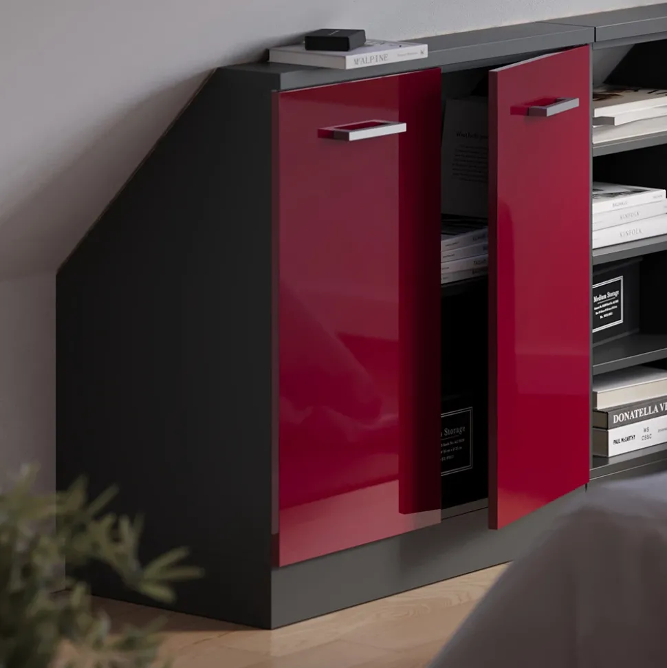 - Der Schrank für Dachschrägen überzeugt mit robuster Bauweise, bequemen Griffen und einer abgeschrägten Oberseite zur optimalen Nutzung des vorhandenen Raums.