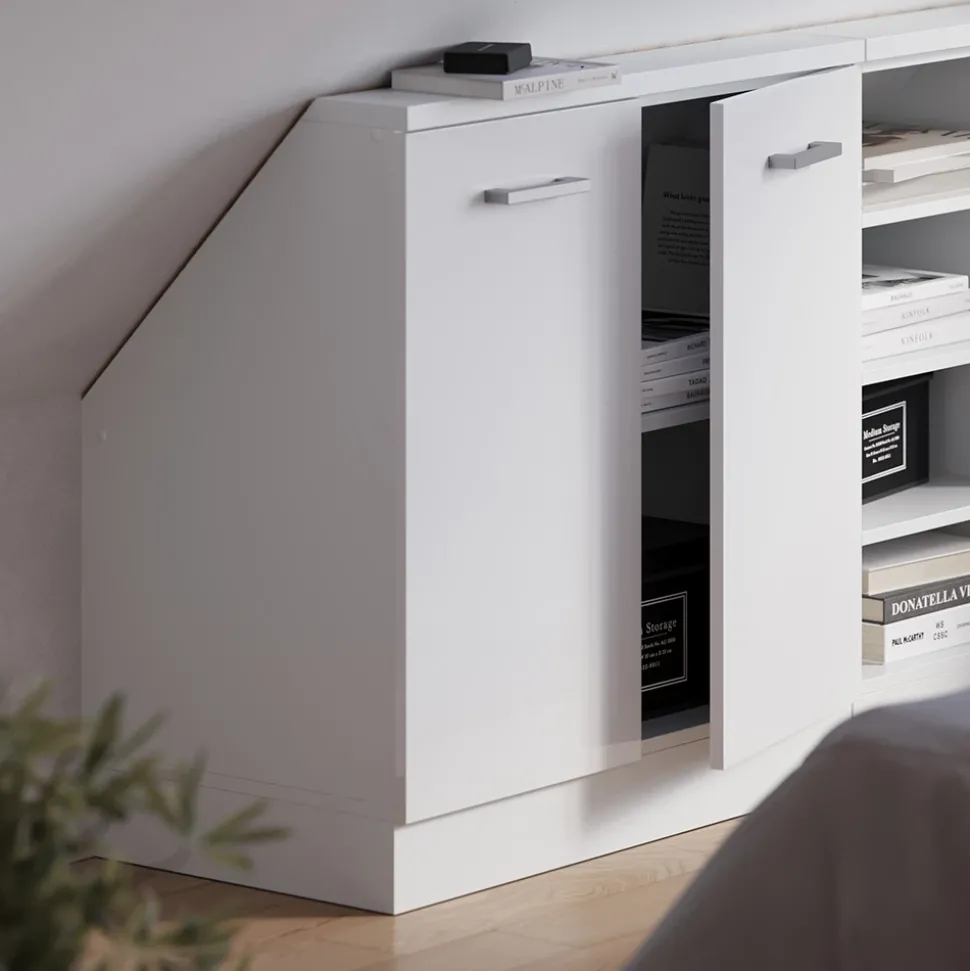 - Der Schrank für Dachschrägen überzeugt mit robuster Bauweise, bequemen Griffen und einer abgeschrägten Oberseite zur optimalen Nutzung des vorhandenen Raums.