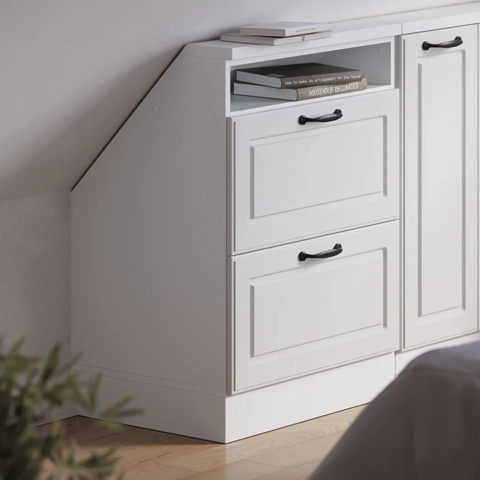 Der Dachschrägenschrank Rion ist die ideale Lösung, um Ihre Dachschrägen optimal zu nutzen. Mit zwei ausziehbaren Schubladen und einem offenen oberen Fach bietet er großzügigen Stauraum für Kleidung und Alltagsgegenstände. Die robuste Konstruktion und die schräge Oberseite machen ihn zu einem stabilen und stilvollen Möbelstück. Versteckte Füße sorgen für sicheren Stand und ein elegantes Gesamtbild.