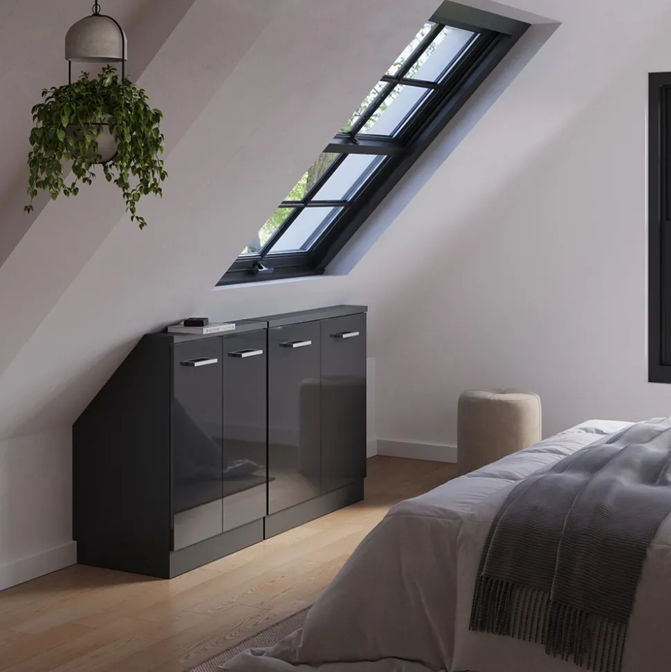Der Dachschrägenschrank Rion ist eine durchdachte Lösung für Räume mit schrägen Wänden. Das speziell angepasste Schranksystem nutzt vorhandene Flächen effizient und schafft praktischen Stauraum. Mit seiner robusten Bauweise und den dezenten Griffen überzeugt Rion im Alltag durch Stabilität und Komfort. Die abgeschrägte Oberseite passt sich optisch harmonisch an. Eine clevere Wahl für mehr Ordnung und Platz unter dem Dach.