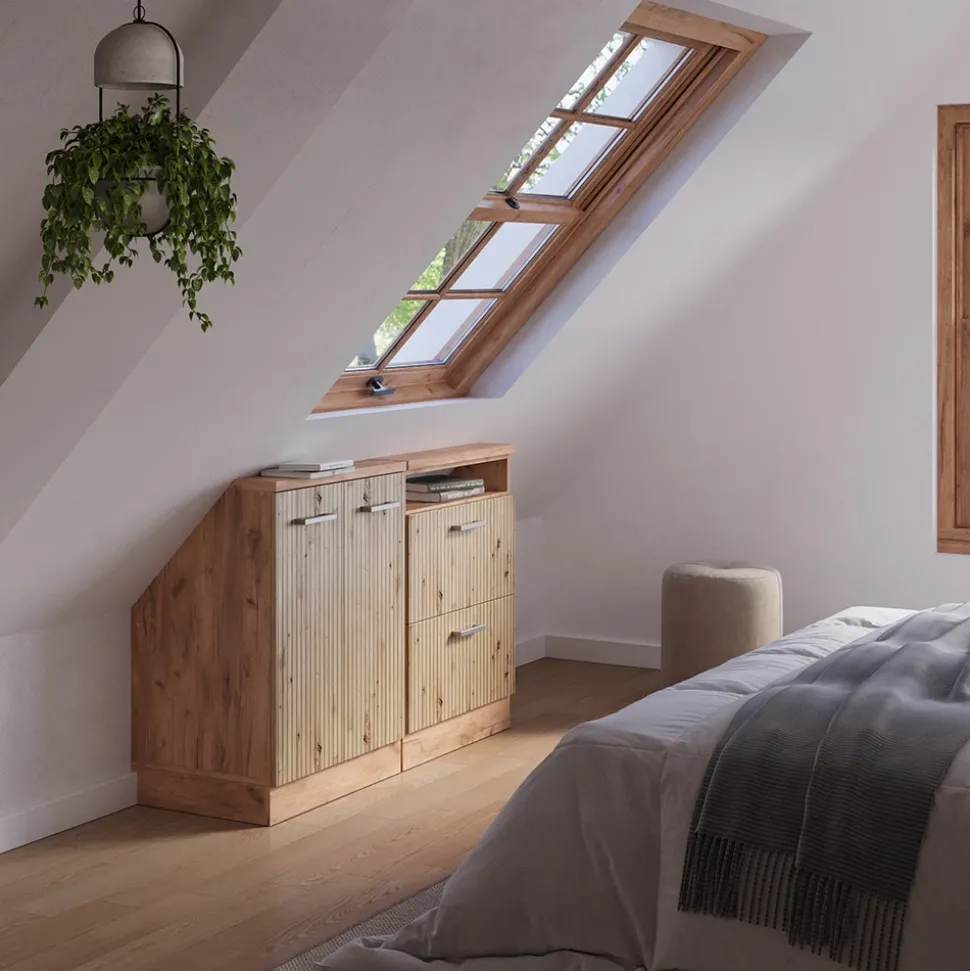 - Das Dachschrägenmöbel-Set besticht durch ein integriertes offenes Fach für zusätzlichen Stauraum und versteckte Füße für eine elegante Optik.