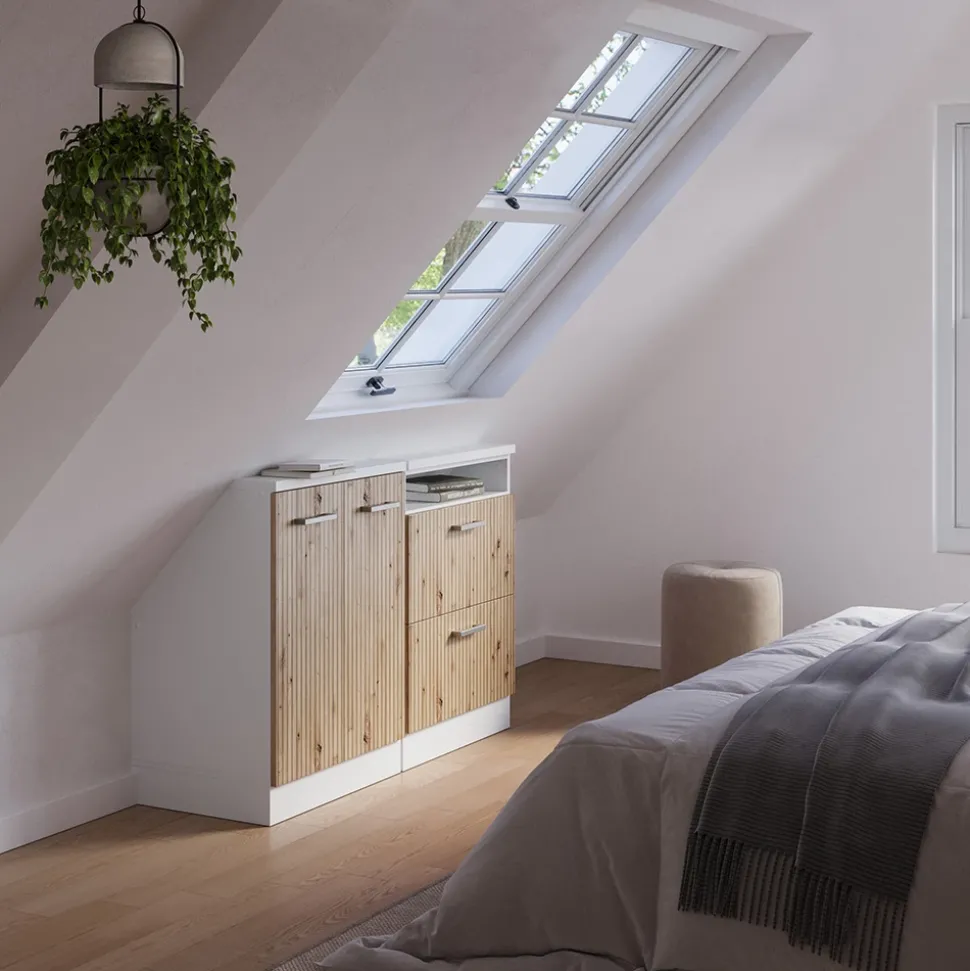 - Das Dachschrägenmöbel-Set besticht durch ein integriertes offenes Fach für zusätzlichen Stauraum und versteckte Füße für eine elegante Optik.