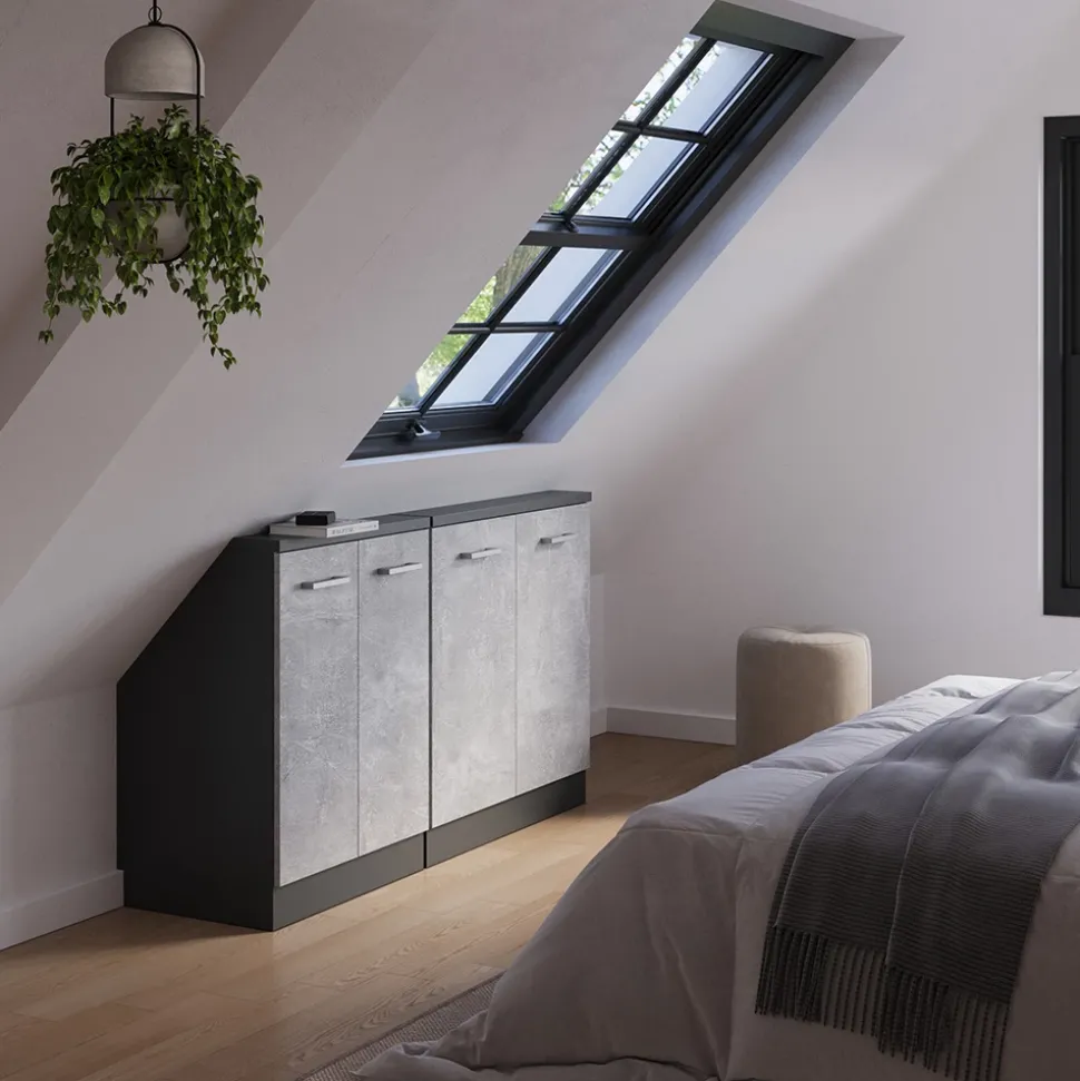 Der Dachschrägenschrank Rion ist eine durchdachte Lösung für Räume mit schrägen Wänden. Das speziell angepasste Schranksystem nutzt vorhandene Flächen effizient und schafft praktischen Stauraum. Mit seiner robusten Bauweise und den dezenten Griffen überzeugt Rion im Alltag durch Stabilität und Komfort. Die abgeschrägte Oberseite passt sich optisch harmonisch an. Eine clevere Wahl für mehr Ordnung und Platz unter dem Dach.