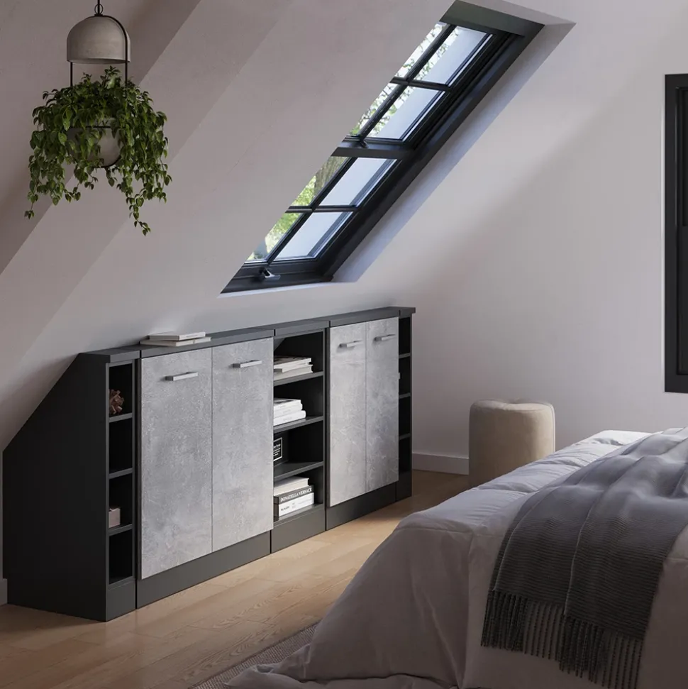 - Das Dachschrägenmöbel-Set besticht durch offene Seitenregale und eine robuste Konstruktion, perfekt für schräge Oberseiten in Dachgeschossen.